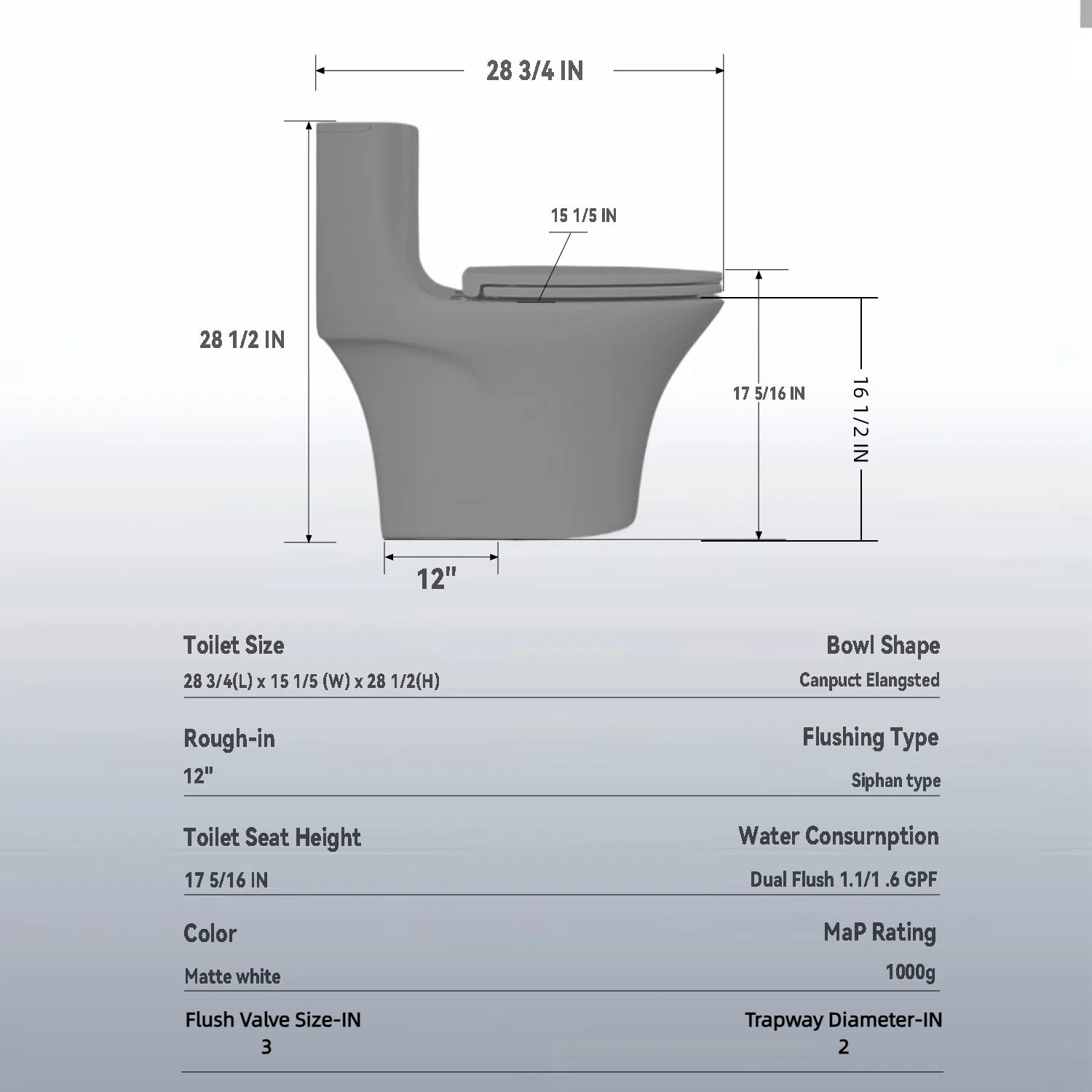 1.1/1.6 GPF Tornado Flush One-Piece Toilet Elongated, Siphonic S-trap 12",Soft Closing Seat, Button on Tank top ,Powerful Dual Flush MAP 1000g, Comfort Chair Seat ADA Height 17", Light gray LG-002