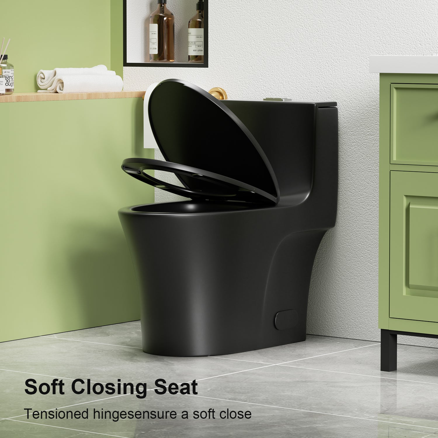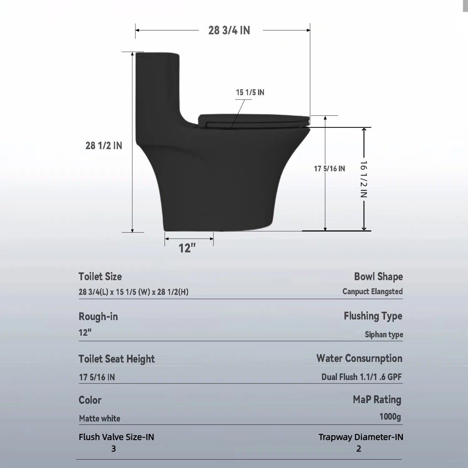 1.1/1.6 GPF Tornado Flush One-Piece Toilet Elongated, Siphonic S-trap 12",Soft Closing Seat, Button on Tank top ,Powerful Dual Flush MAP 1000g, Comfort Chair Seat ADA Height 17", Matte black MB-002