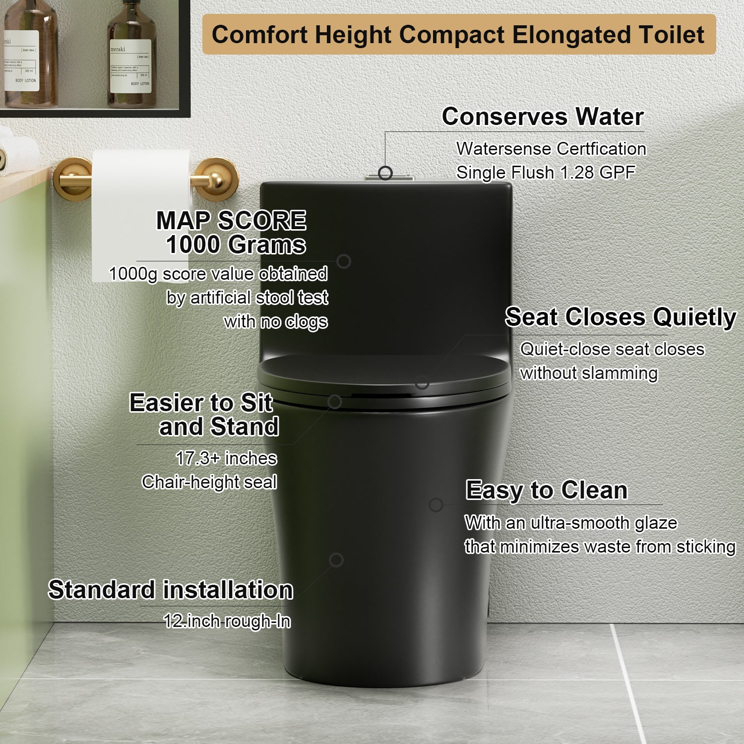- Designed with accessibility in mind, the toilet has a comfort height of 17 inches, meeting ADA standards and making it suitable for individuals with disabilities or limited mobility.