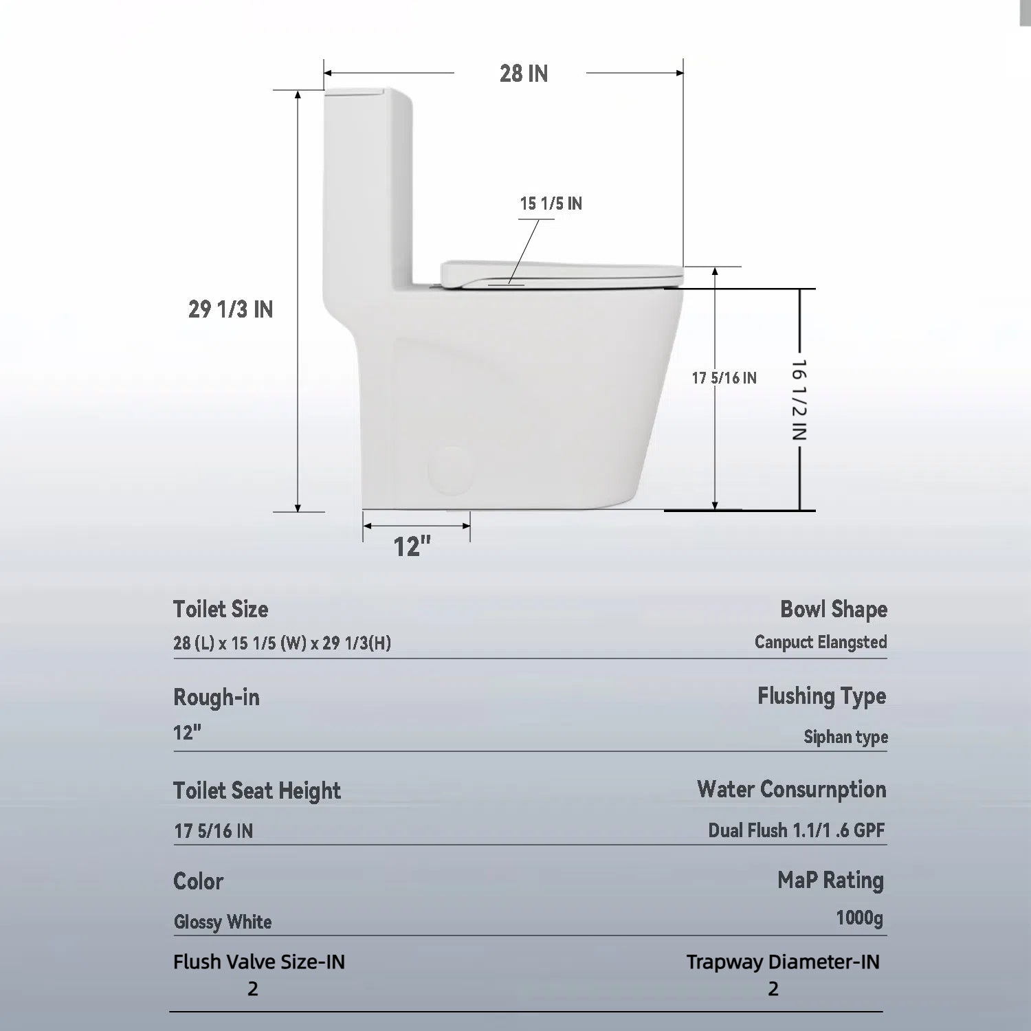 - Dual Flush Design - The highly efficient dual-flush system allows you to choose between 1.1 GPF (gallons per flush) for liquid waste and 1.6 GPF for solid waste, helping you conserve water without compromising performance. Meets EPA WaterSense® HET Criteria and achieves MaP 1000 gram. The siphon flushing mechanism ensures a quiet yet powerful flush, preventing clogs and leaks.