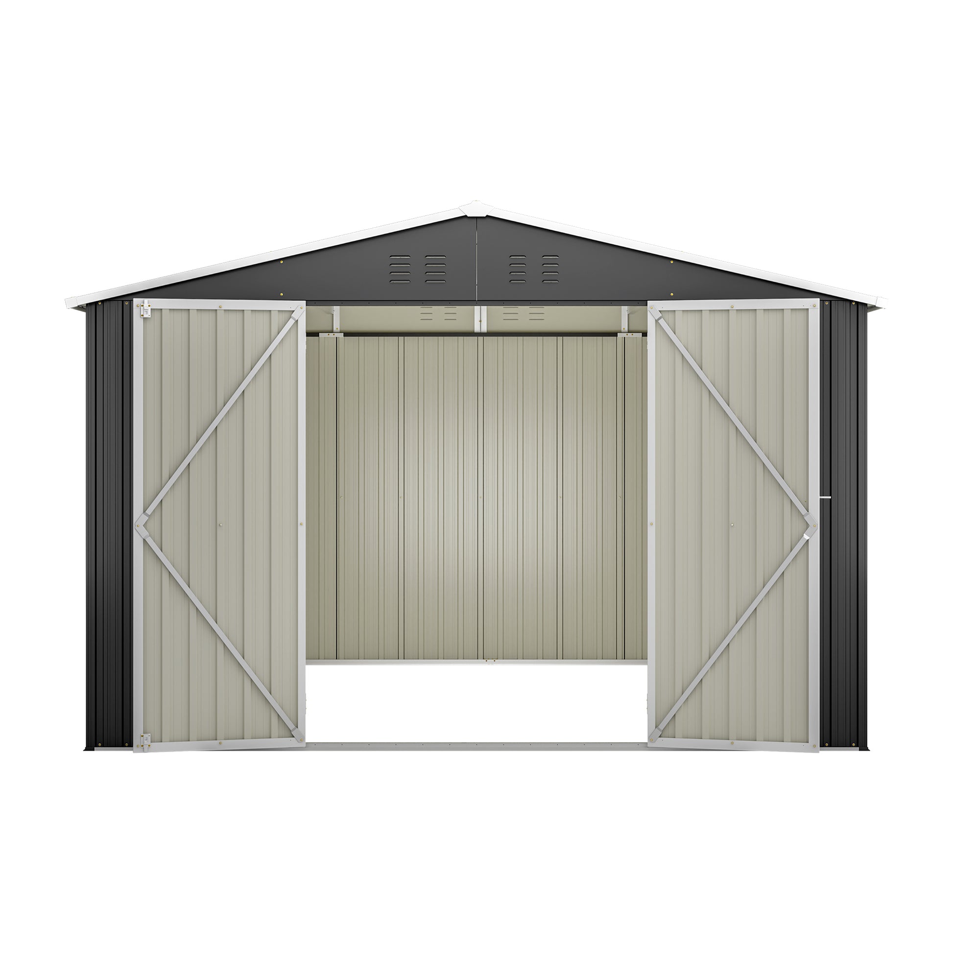- Durable and Practical: The storage shed is constructed from galvanized steel, ensuring a solid and robust overall structure. The exterior is coated with a protective paint layer and features ventilation openings, effectively blocking UV radiation. The sloping roof design, combined with arched aluminum panels, significantly enhances overall waterproof performance.