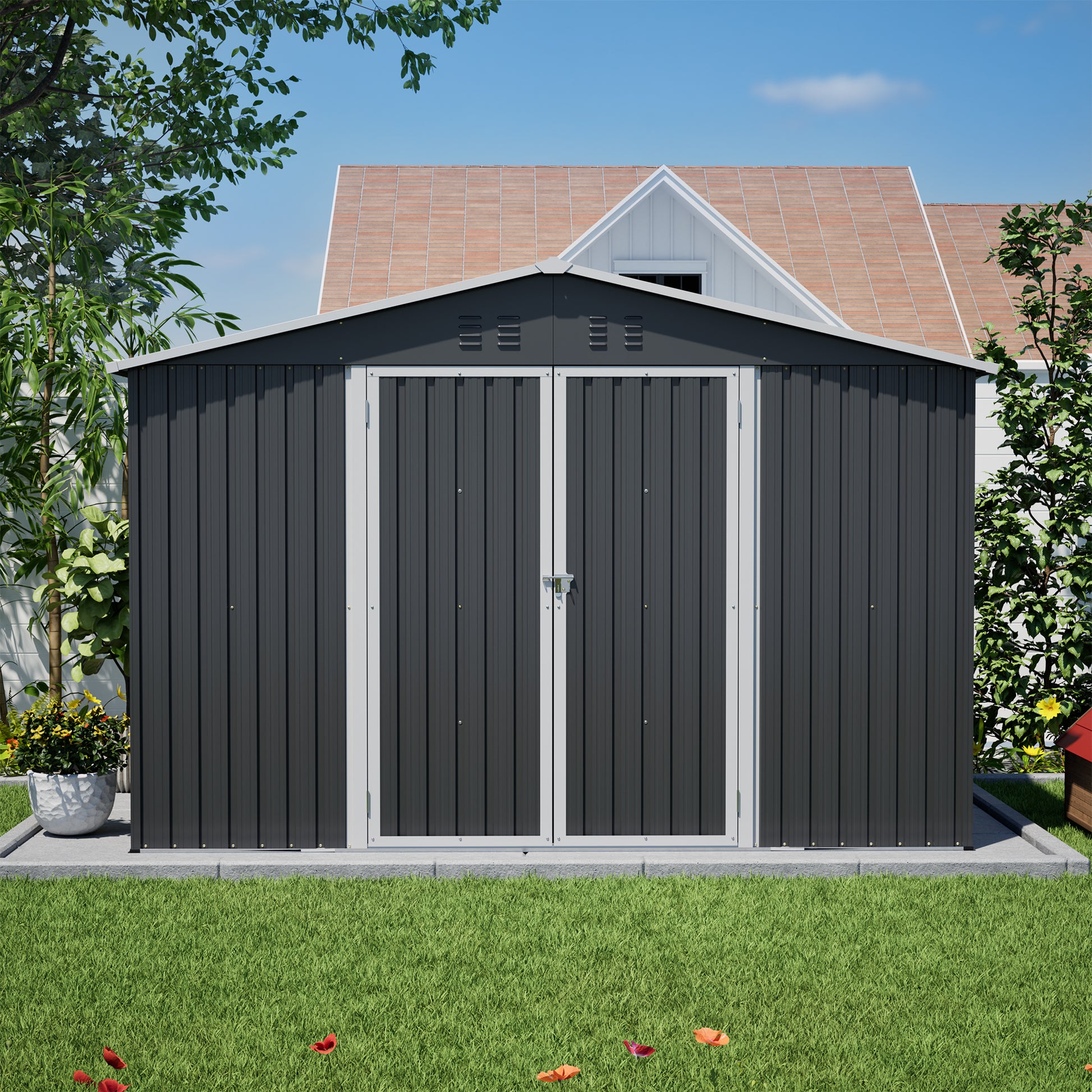 10x10 FT Large Outdoor Metal Storage Shed - Updated Heavy-Duty Frame & Lockable Double Doors, All-Weather Utility Garden Shed for Backyard, Lawn, Patio Tools & Equipment, Black