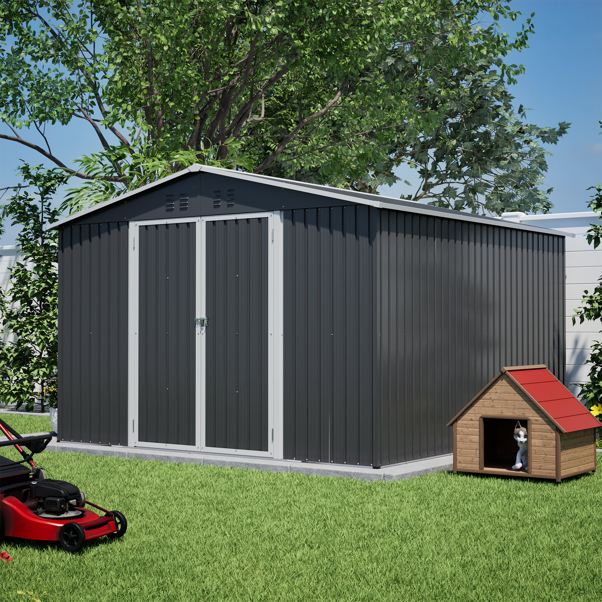 - Ample Storage Space: The internal dimensions of this outdoor storage shed are 118.11 inches (width) × 122.6 inches (depth) × 79.21 inches (height), offering a spacious yet well-proportioned capacity to accommodate all your gardening tools, various equipment, or toys. You can neatly stack garden tools inside while easily storing automated equipment such as lawn mowers and snow blowers.