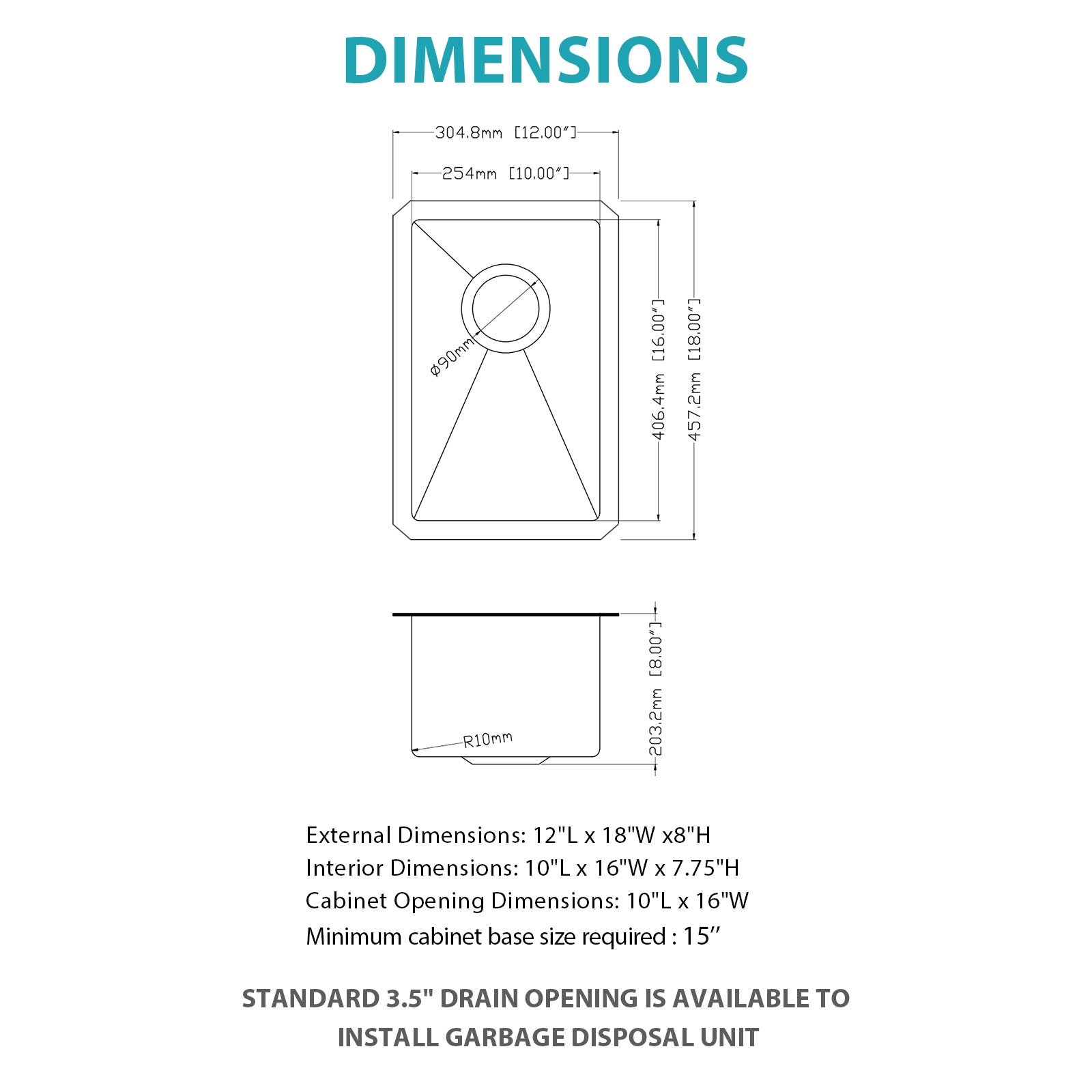- [Dimensions] Exterior Dimensions: 12" x 18" x 8" (Minimum Recommended cabinet size: 15 inches). Interior Dimensions: 10" x 16" . Standard 3-1/2" drain opening fits most common garbage disposals. Recommended Cutout Size: 10 x 16 inches.