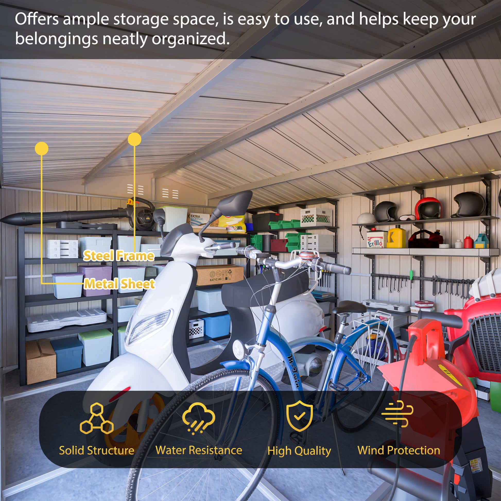 - 【Premium All-Weather Protection】Crafted from superior, thickened galvanized steel, this shed is built to last. It features excellent waterproof, rust-resistant, and UV-resistant properties, providing reliable, year-round protection for your belongings against rain, snow, harsh sun, and corrosion. Your tools and equipment are safe in any season.