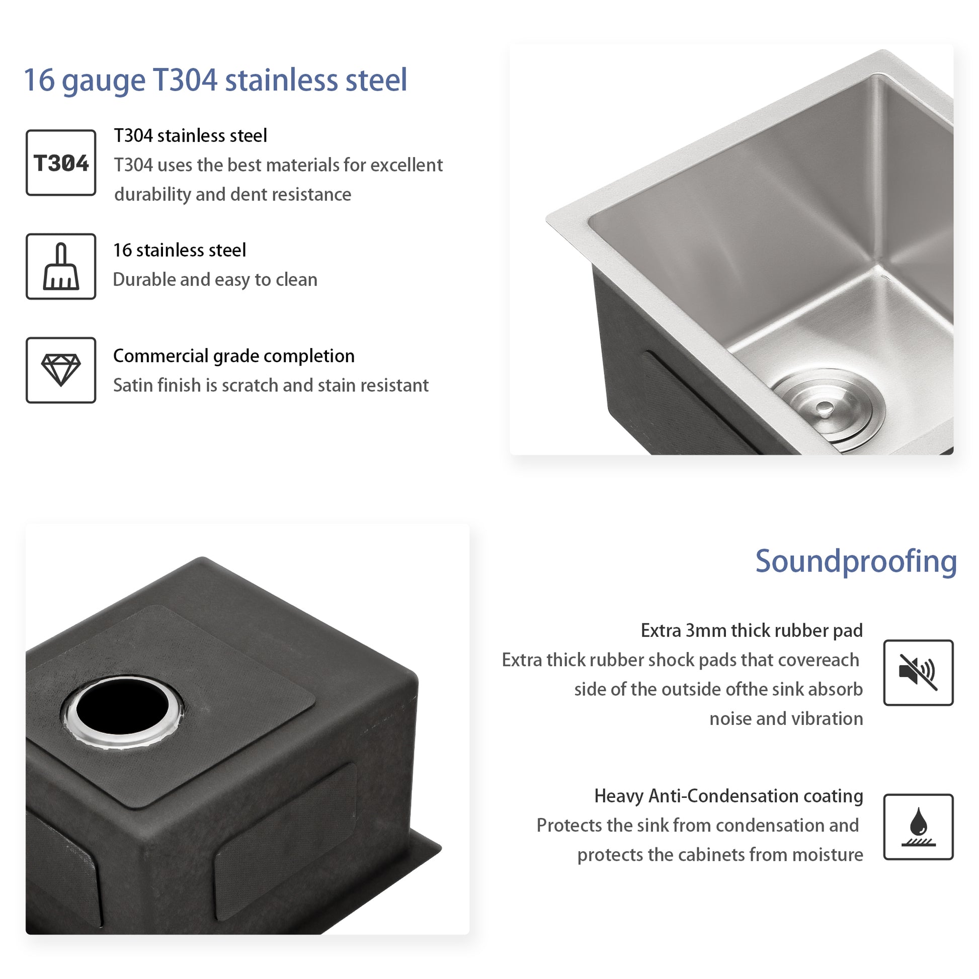 - [Quality Materials] The sink is handcrafted from the top quality food grade 304 stainless steel available on the market, creating a hard, non-porous, smooth surface that is easy to clean and doesn't build up bacteria, making the sink more durable.