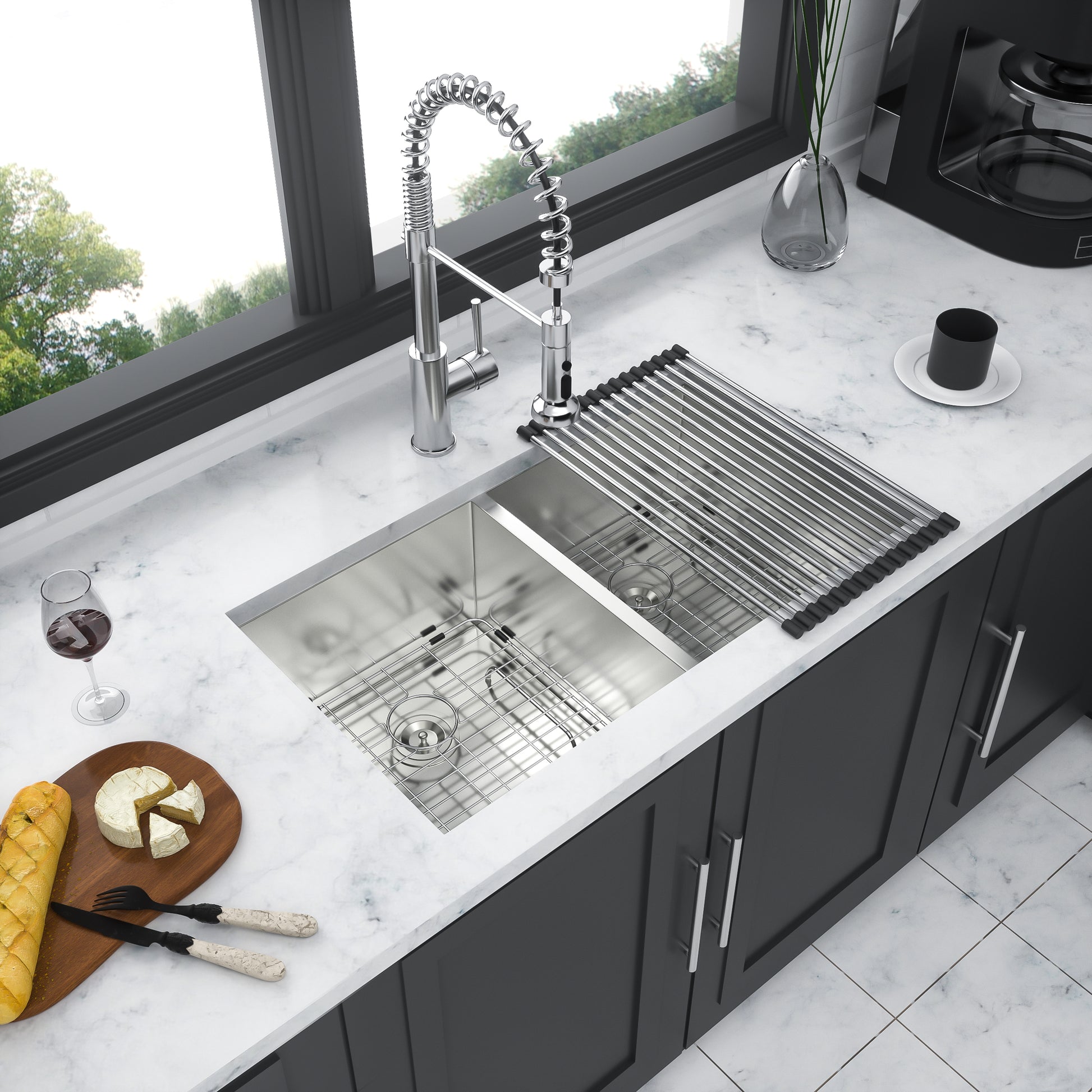 - [Included in the Package] Comes with this kitchen sink: 2 x 304 stainless steel dish grid, 2 x drain assembly, 1 x drying rack,1 x installation clips, 1 x cutout template and installation Guide.