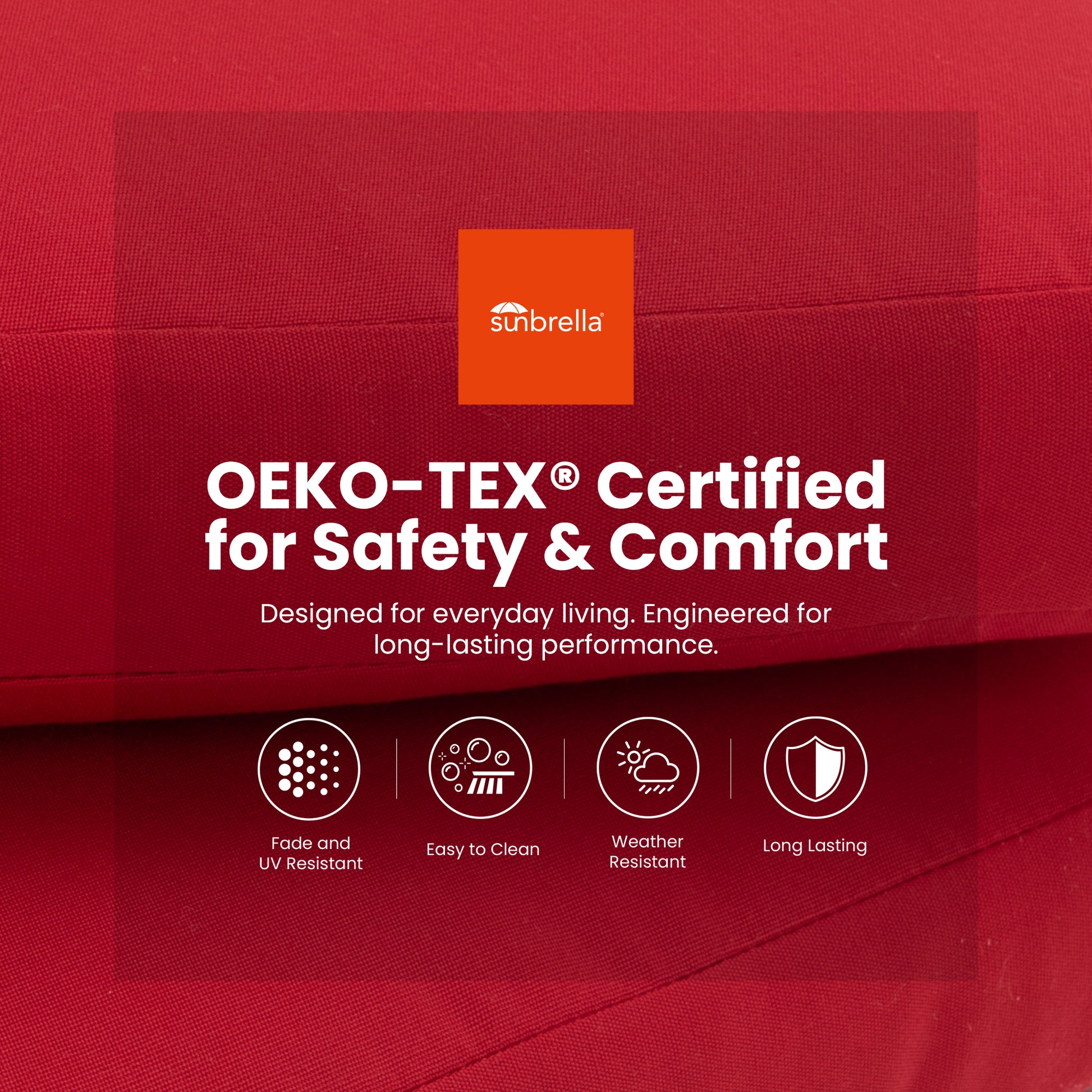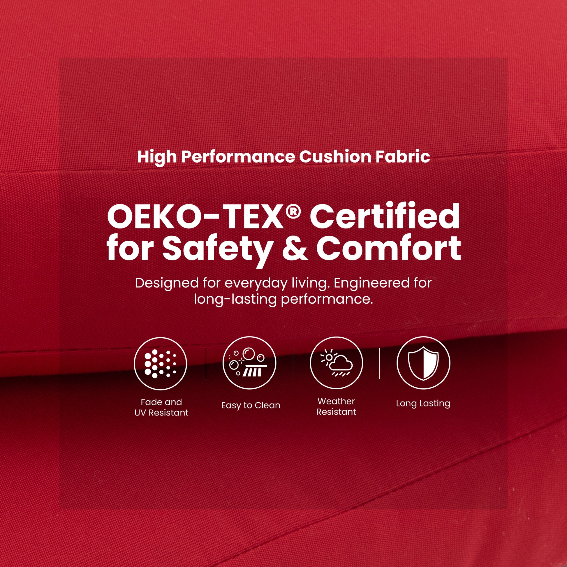 - Sunbrella Fabric Cushion – Durable & Weather-Resistant – Upholstered in premium Sunbrella fabric (Jocky Red), the cushion is thicker, fade-resistant, stain-resistant, and designed for outdoor durability. The removable high-density foam cushion offers great resilience, retains its shape, and features a zippered cover for easy cleaning.