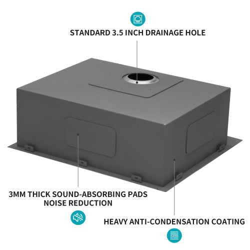 - [Coating and Silencer Pad]There is a thick coating on the outside of the sink to prevent condensation caused by weather changes. In addition, the 3mm thick rubber silencer pad can greatly reduce the noise from the faucet and give you a quieter cooking environment.