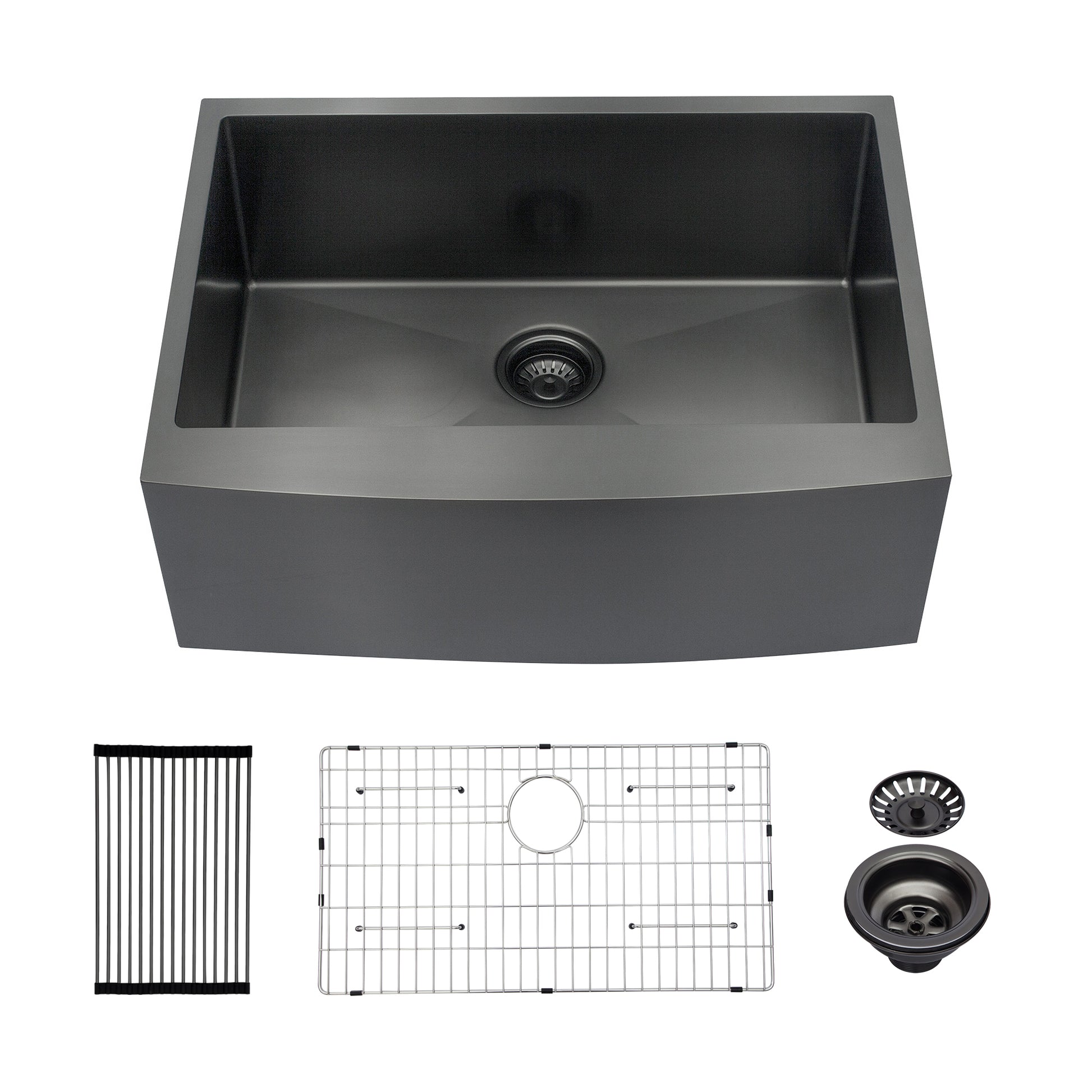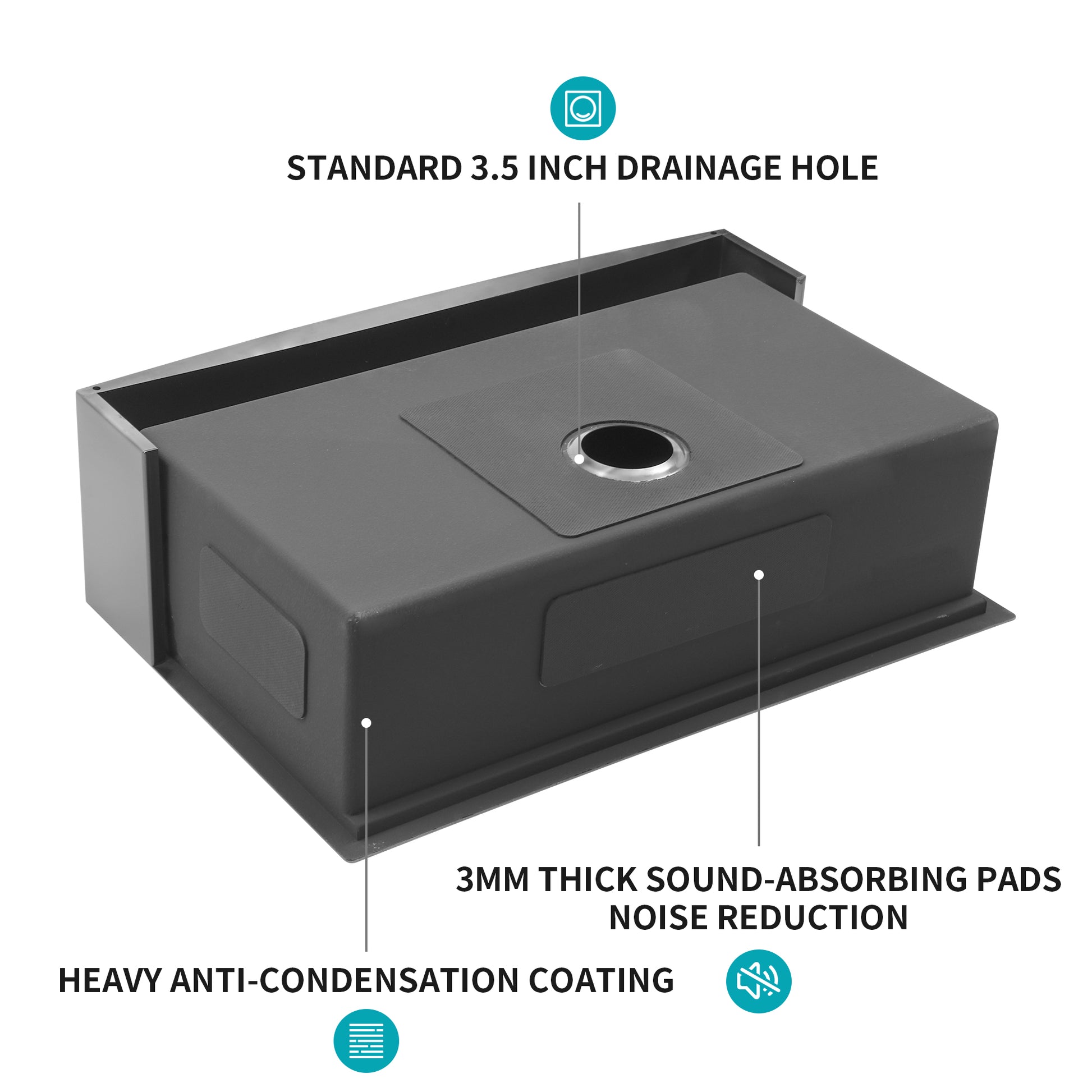 - [T304 Nano Stainless Steel 16G construction] This 27 inch Gunmetal Black Farmhouse Sink is constructed by heavy duty 16 gauge T304 stainless steel for superior strength and durability.The Gunmetal Black finish is applied as an outer layer using an innovative nano technique that makes it incredibly tough and resistant to wearing or peeling.Nano surface is repelling to water and oil as lotus leaf, so the kitchen sink is so easy to clean and free of finger print.