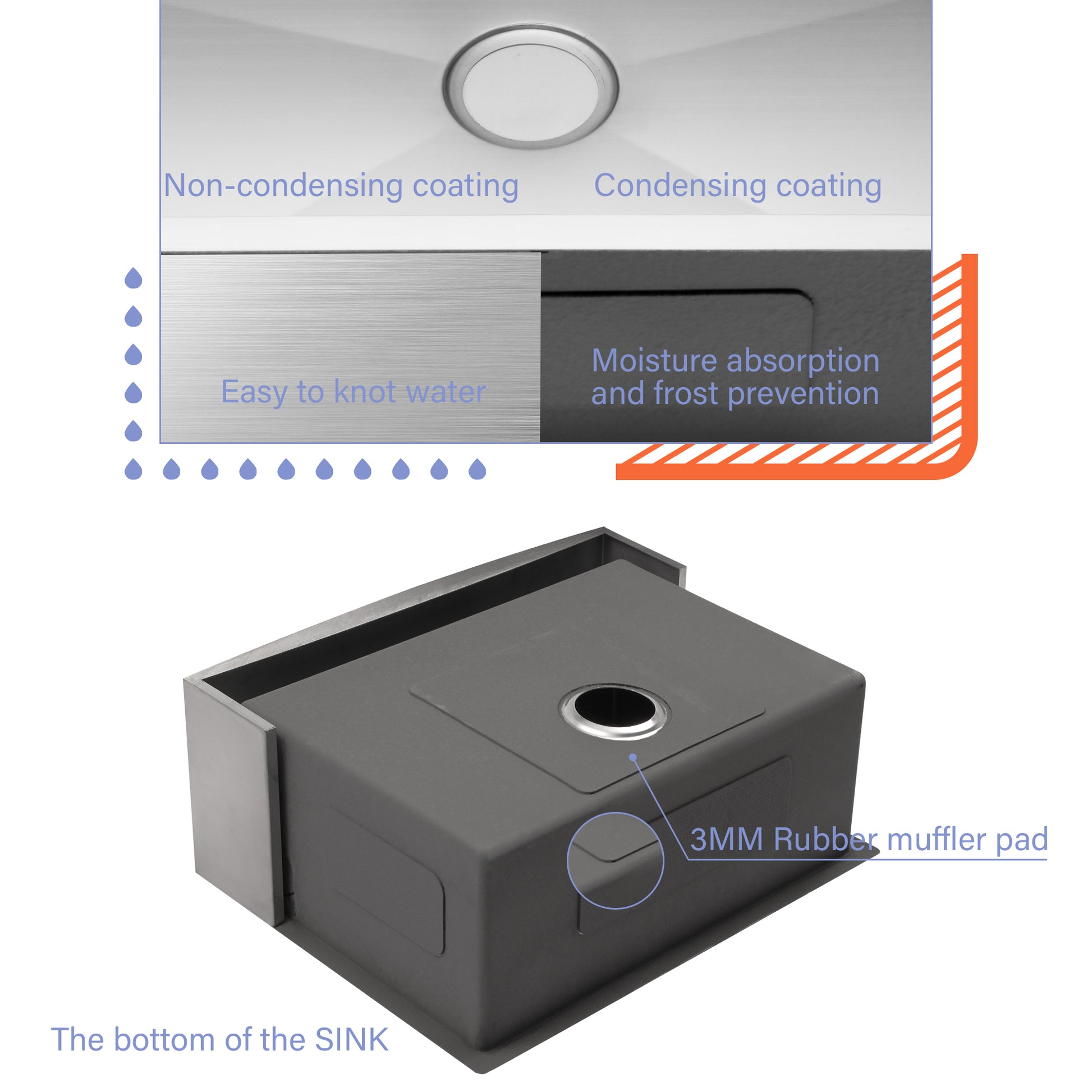 - [Coating and Silencer Pad]There is a thick coating on the outside of the sink to prevent condensation caused by weather changes. In addition, the 3mm thick rubber silencer pad can greatly reduce the noise from the faucet and give you a quieter cooking environment.