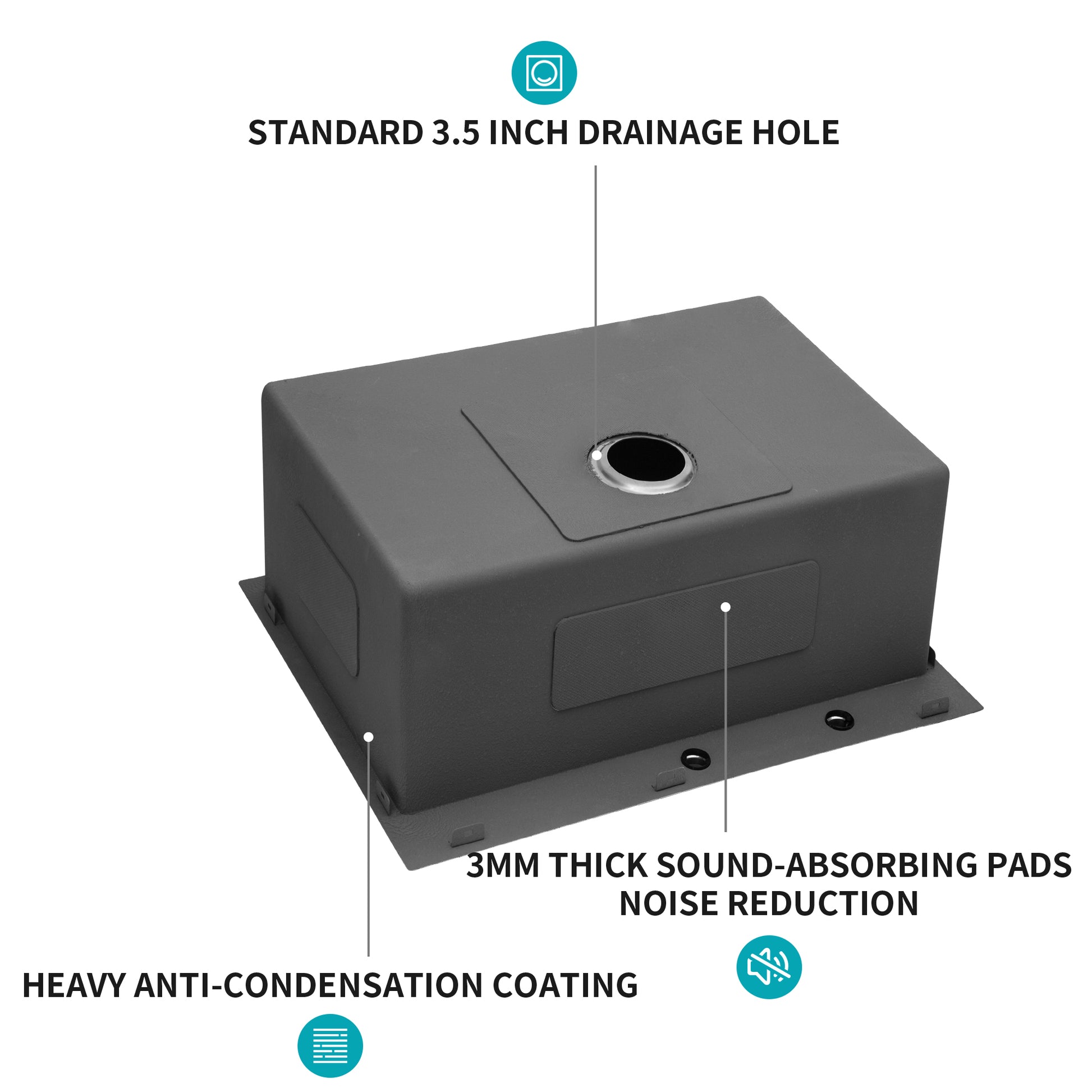 - [Coating and Silencer Pad]There is a thick coating on the outside of the sink to prevent condensation caused by weather changes. In addition, the 3mm thick rubber silencer pad can greatly reduce the noise from the faucet and give you a quieter cooking environment.