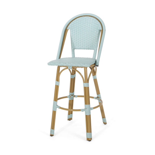 29.5" Outdoor PE Rattan and Aluminum French Barstools, Set of 2, Light Teal and Bamboo Finish