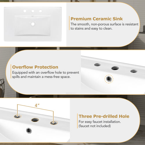 - [Keep Your Bathroom Organized]Equipped with a 30" sink, this bathroom vanity provides ample storage space, featuring 1 cabinet and 3 drawers of different depths and widths, perfect for neatly organizing various bathroom essentials, keeping your bathroom tidy and clutter-free.