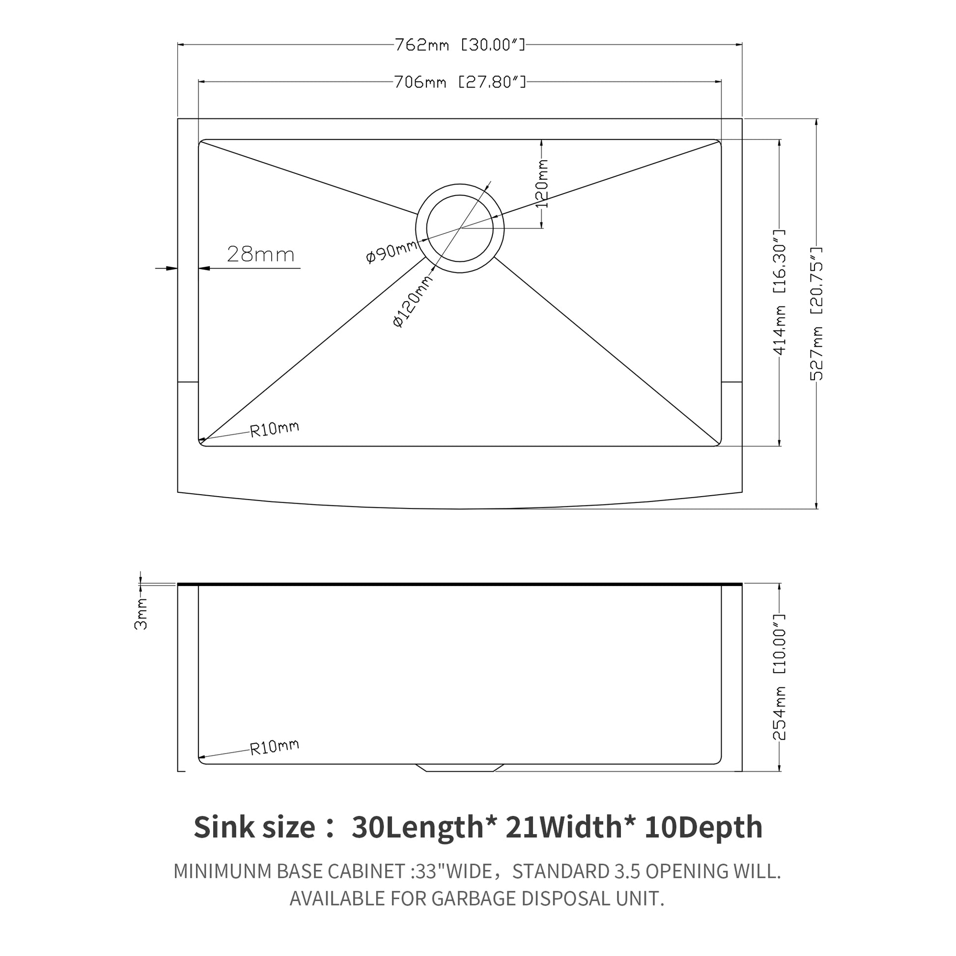 - [Dimensions] External Dimensions:30 x 21 x 10 inch, Internal dimensions: 27.8 x 16.3 inch. Minimum cabinet size is 33 inch. Farmhouse Sink rear set 3.5” drain hole that matches most kitchen appliances and fits the most common garbage disposal system.