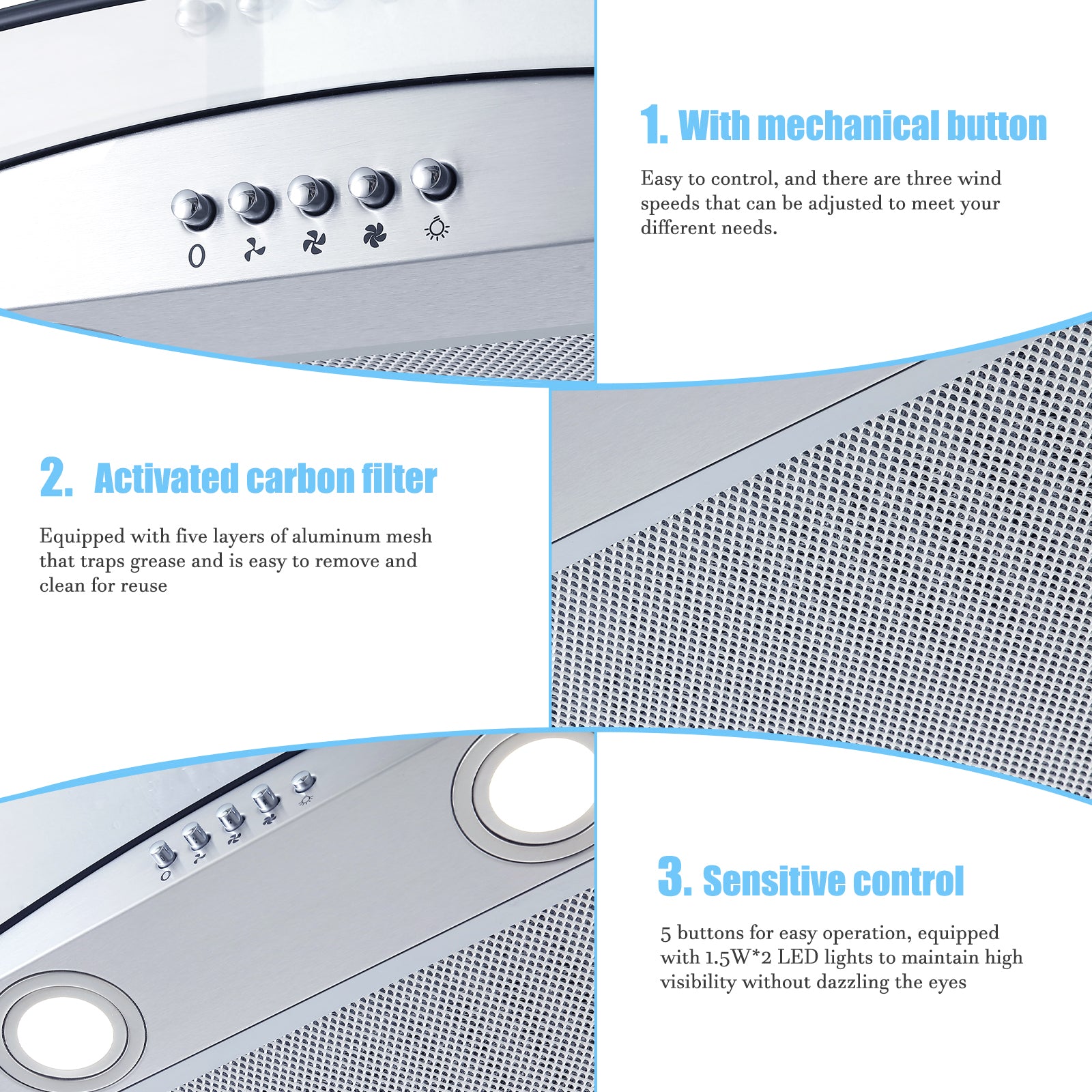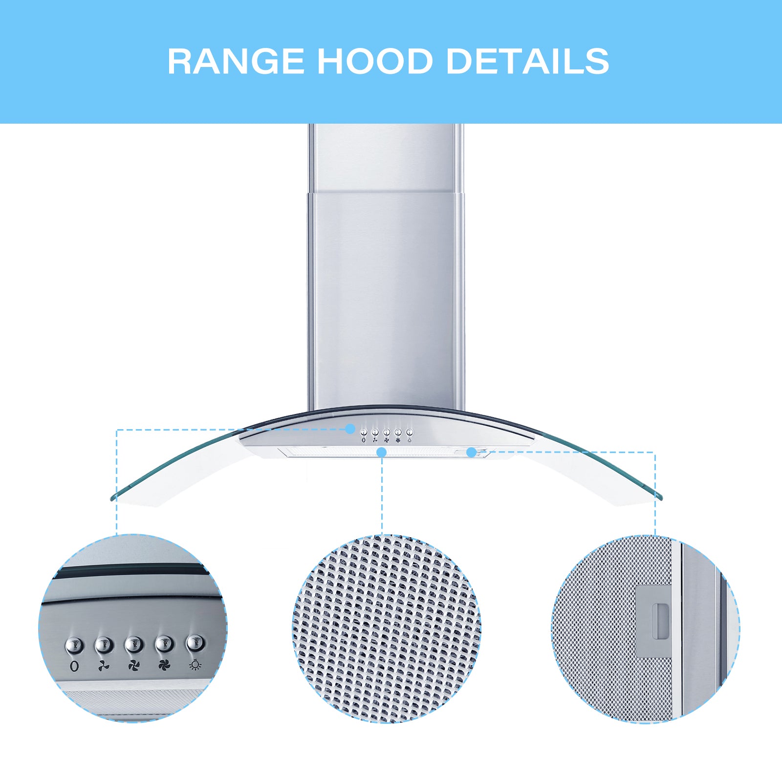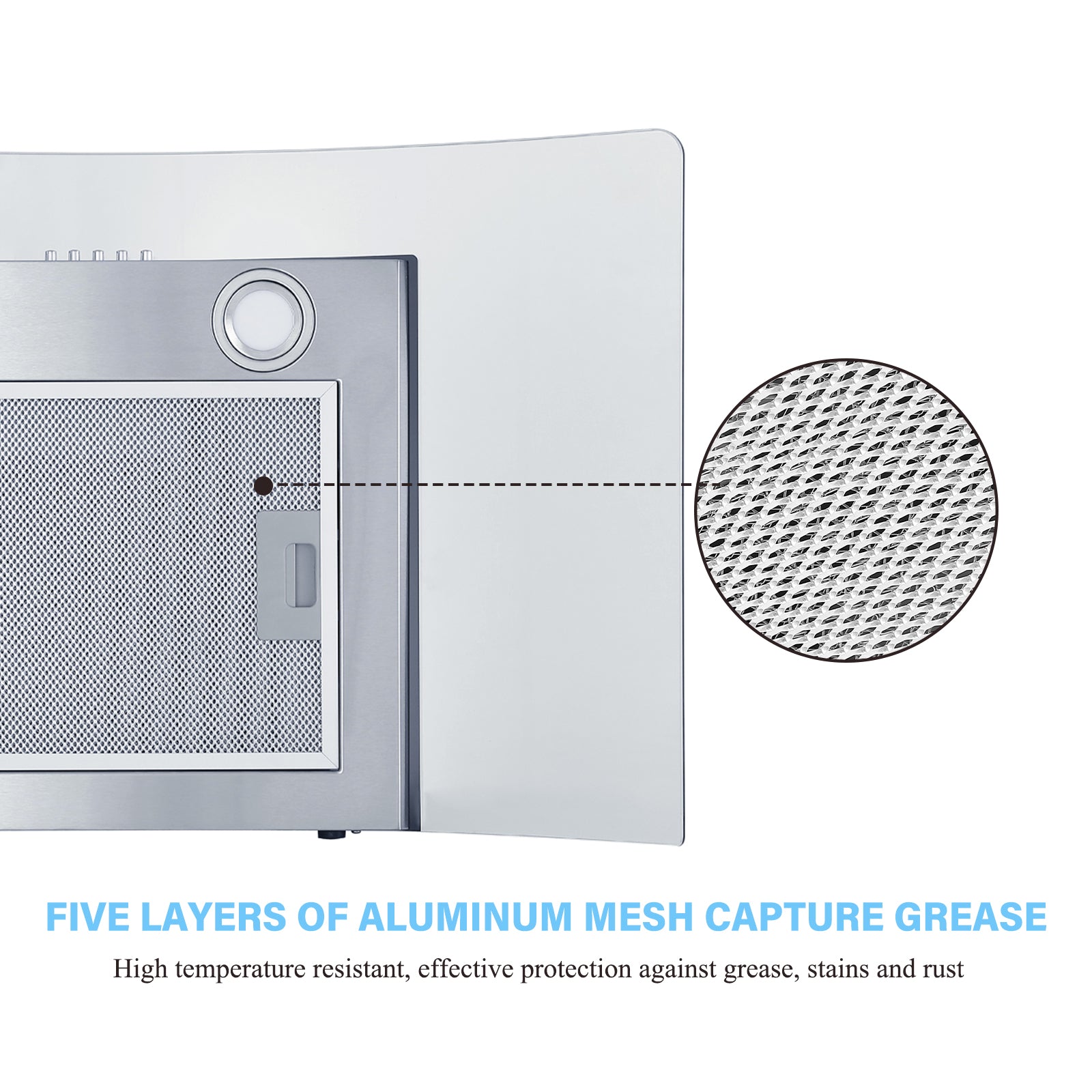 This is the perfect range hood for any kitchen. Made of 6mm curved glass and high-end 430 stainless steel with a brushed finish, this range hood is easy to clean as the range hood is non-magnetic and rust-proof. The vent hood features a 3-speed push button control; operates smoothly with just the touch of a finger, the Professional Vent Hood 30" features a baffle filter to protect your range hood by capturing grease particles; easy to maintain and save costs by simply putting it in the dishwasher; ensures perfect airflow and efficient ventilation throughout the kitchen. The popular 30" size fits most homes. Enjoy cooking with this range hood.