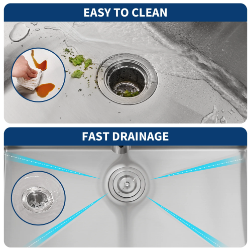 - Complete Water Draining: the design of single bowl kitchen sinks sloping bottom and X grooves make water flow into the drain immediately, no need to remove it by hand. 3.5 inch sink drain opening fits standard garbage disposal unit in the US