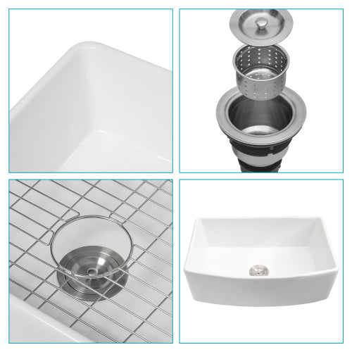 30" White Farmhouse Sink - 30 x 19 x 10 inch White Kitchen Sink Ceramic Porcelain Arch Edge Apron Front Single Bowl Farm Kitchen Sinks