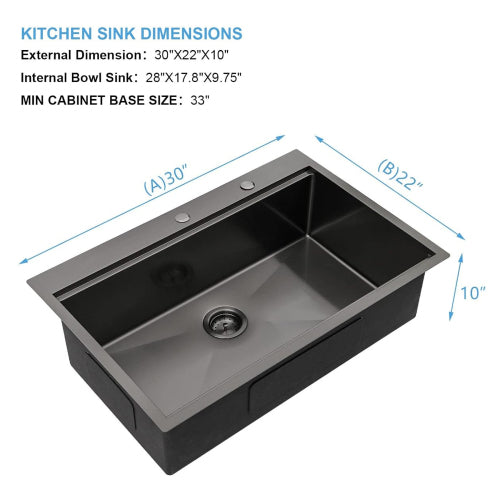 30" x 22" Black Drop In Kitchen Sink, 16 Gauge Stainless Steel Workstation Sink