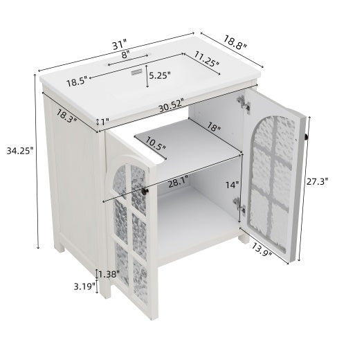 31" Farmhouse Bathroom Vanity with Ceramic Sink, Faux Aged Finish, Vintage Rustic Bathroom Cabinet with Bronze Pulls and 2 Soft-Closing Doors, Antique White