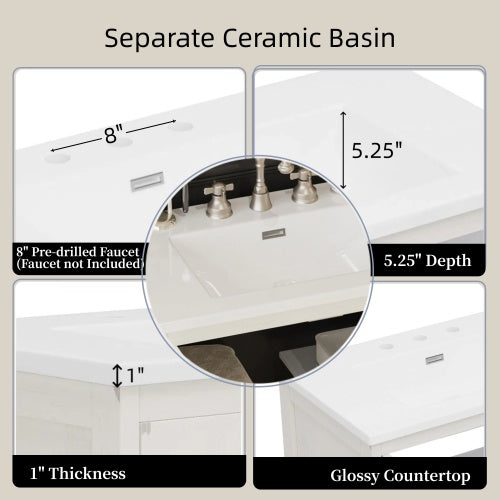 - High-Quality Rectangle Ceramic Sink – Durable & Easy to Maintain: The integrated rectangle ceramic sink is designed for both beauty and practicality, offering a smooth, glossy surface that is resistant to water stains, scratches, and discoloration. The deep basin provides ample washing space, while the pre-drilled faucet hole ensures quick and easy installation of your preferred faucet style. Its non-porous surface allows for effortless cleaning and maintenance.