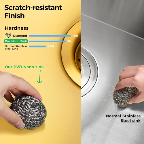 - Premium Material: this gold kitchen sink is made of Top-Grade 304 stainless steel 16 gauge thickness with ultra-thick 3 mm flange for superior dent and rust resistance. The finish is applied as an outer layer using innovative NANO-PVD technology that makes it work non-oil stick and no water trace left. It's more scratch-resistant than ordinary sinks. The unique craftsmanship makes the sink very strong and looks very luxurious