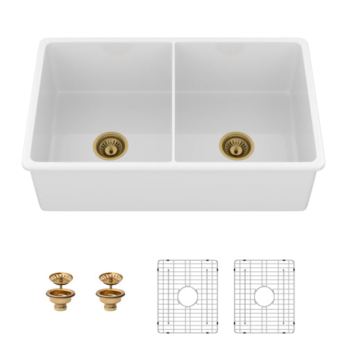 - [What's in the Package] Include a 32 inch kitchen sink, 2 x 304 stainless steel dish grid, 2 x gold basket strainer.