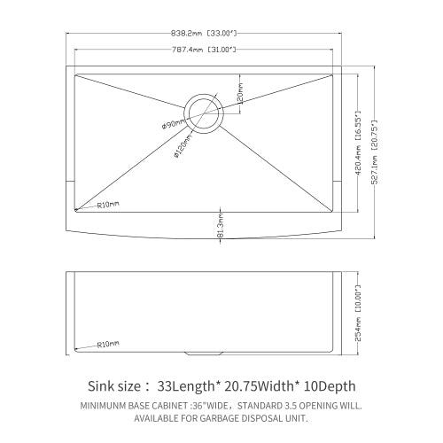 - [Dimensions] External Dimensions:33 x 21 x 10 inch, Internal dimensions: 31 x 16.55 inch. Minimum cabinet size is 36 inch. Standard 3.5" drain openings will fit any garbage disposal unit.
