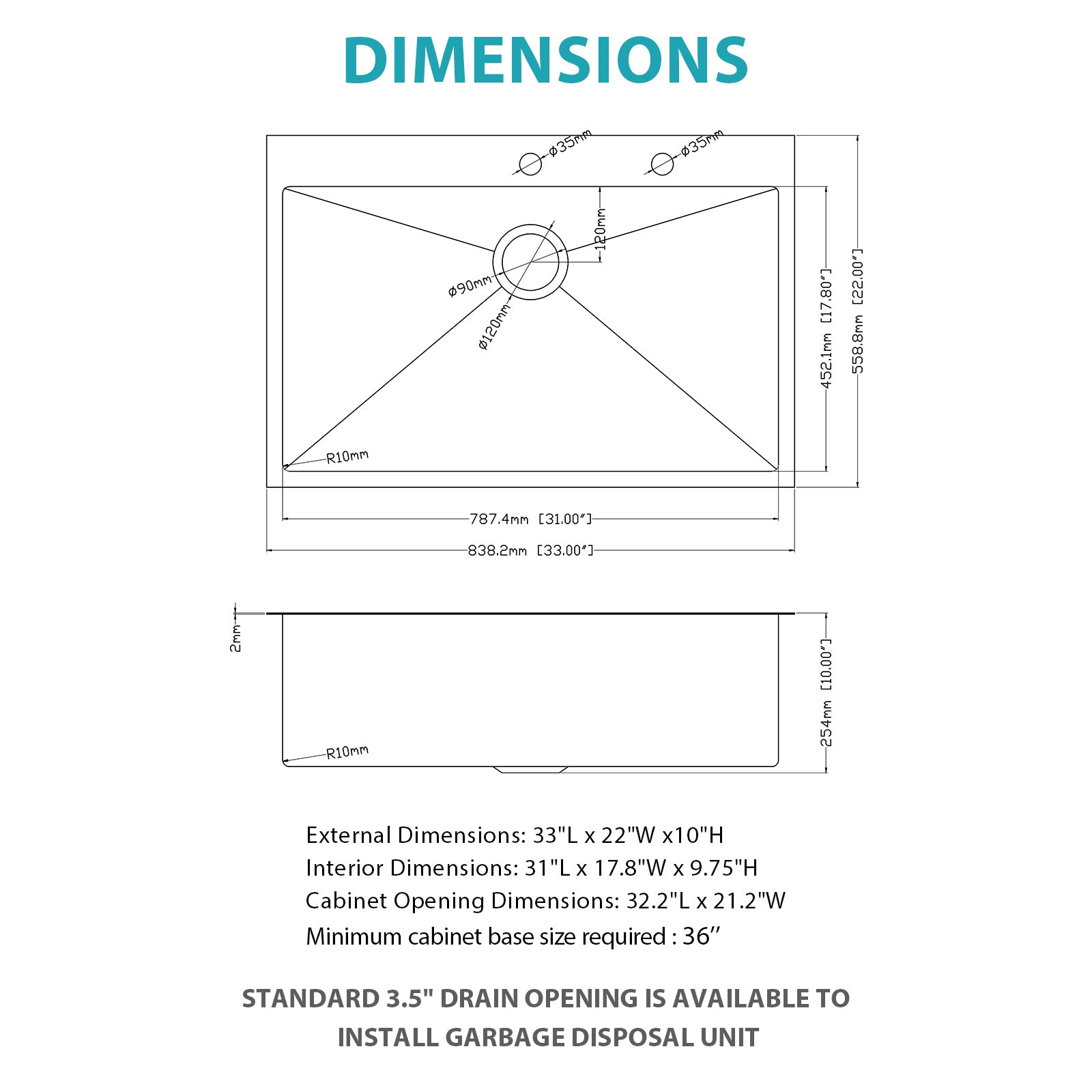 - [Dimensions] Exterior Dimensions: 33" x 22" x 10" (Minimum Recommended cabinet size: 36 inches). Interior Dimensions: 31" x 17.8" x 9.75" . Standard 3-1/2" drain opening fits most common garbage disposals. Recommended Cutout Size: 32.2 x 21.2 inches.