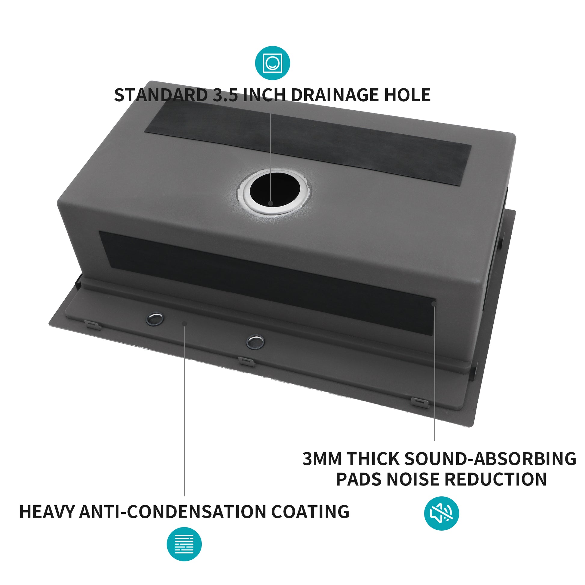 - [Coating and Silencer Pad] There is a thick coating on the outside of the sink to prevent condensation caused by weather changes. In addition, the 3mm thick rubber silencer pad can greatly reduce the noise from the faucet and give you a quieter cooking environment.