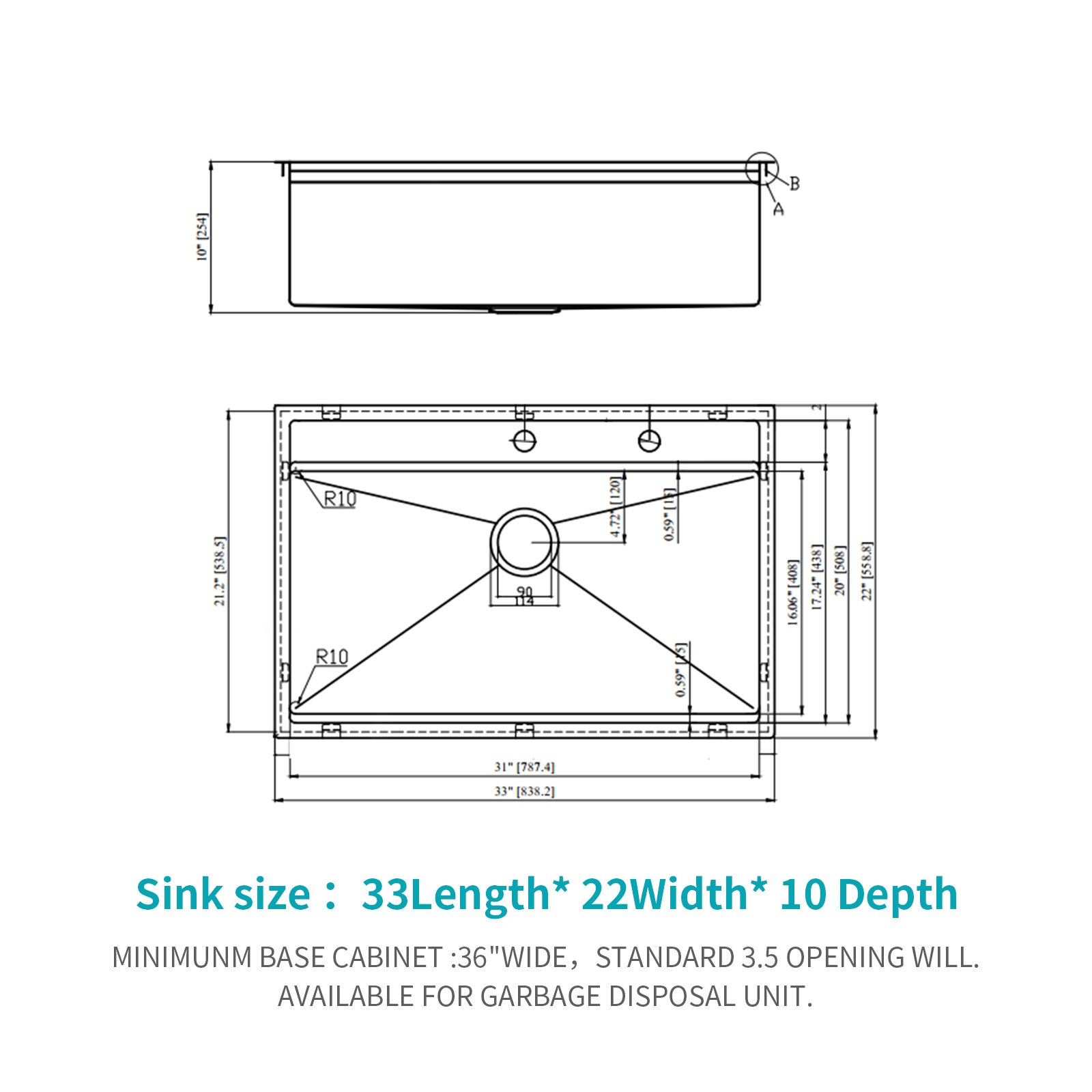 - [Dimensions] Exterior Dimensions: 33" x 22" x 10" (Minimum Recommended cabinet size: 36 inches). Interior Dimensions: 31" x 16.06" . Standard 3-1/2" drain opening fits most common garbage disposals. Recommended Cutout Size: 32.2 x 21.2 inches.