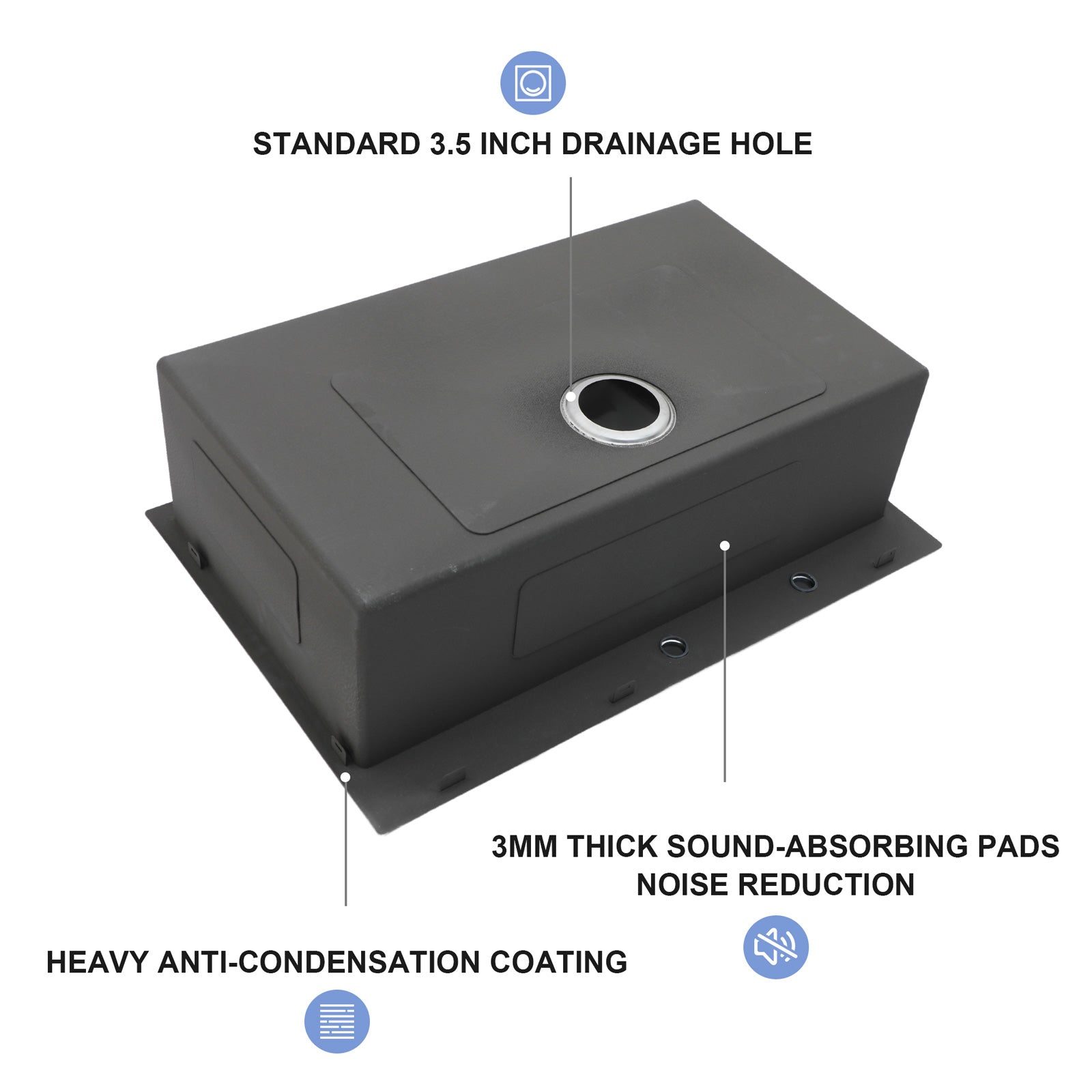 - [Coating and Silencer Pad] There is a thick coating on the outside of the sink to prevent condensation caused by weather changes. In addition, the 3mm thick rubber silencer pad can greatly reduce the noise from the faucet and give you a quieter cooking environment.