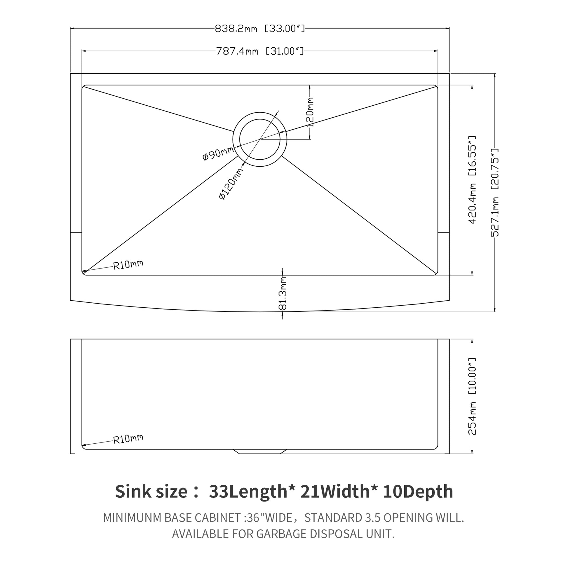 - [Dimensions] External Dimensions:33 x 21 x 10 inch, Internal dimensions: 31 x 16.55 inch. Minimum cabinet size is 36 inch. Farmhouse Sink rear set 3.5” drain hole that matches most kitchen appliances and fits the most common garbage disposal system.