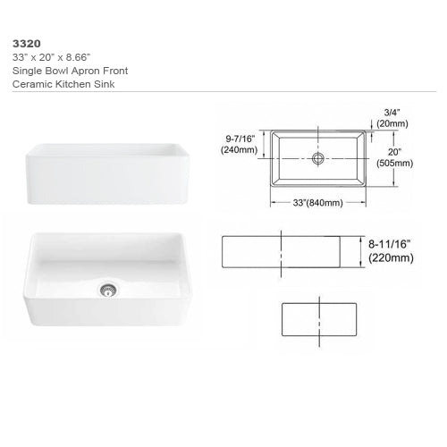 33" L X 20" W Single Basin Ceramic Farmhouse Kitchen Sink with Basket Strainer