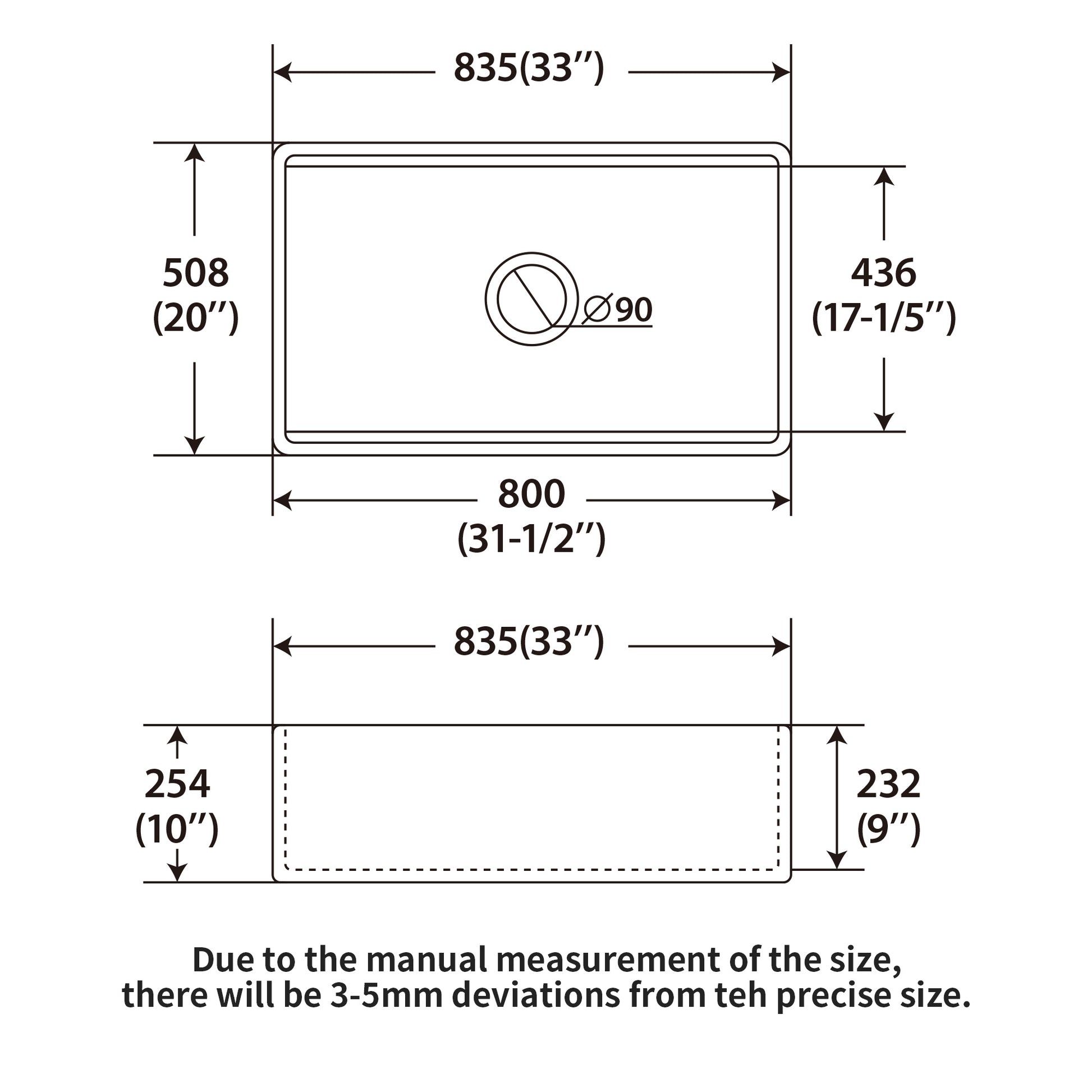 - [Stylish Deep White Kitchen Sink Size] Exterior - 33" x 20" x 10". Large single bowl kitchen sink has exactly an appropriate size to fit into more cabinets. With enough depth to hold and clean pans, pots and grills without splashing around, this deep kitchen sink helps you tackle more housework at once.