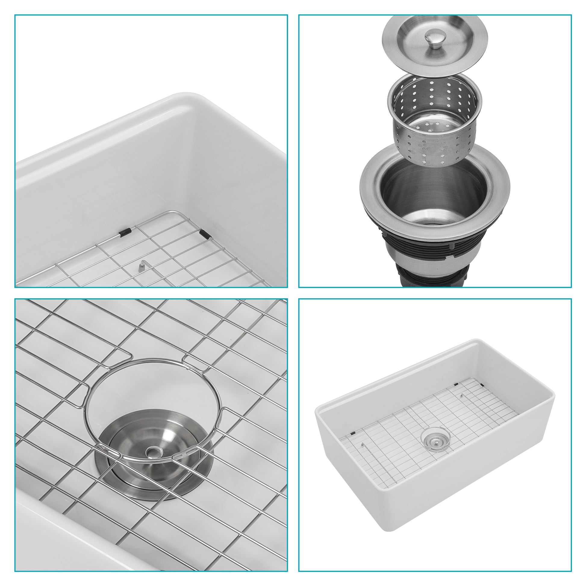 - [What's in the Package] Package comes in farmhouse kitchen sink:1 x 304 stainless steel dish grid, 1 x drain assembly, 1 x drying rack,1 x cutting board,1 x colander,1 x installation clips, and installation Guide.