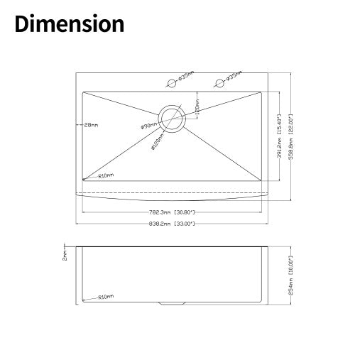 - Farmhouse Apron Single Bowl Stainless Steel Kitchen Sink with dent-resistant T304 stainless steel for superior strength and durability. Surfaces are rust and stain-resistant, easy to clean, and long-lasting.Dimension: Overall size: 33"x22"x10", Interior bowl: 30.8"x15.4", Detph: 9"