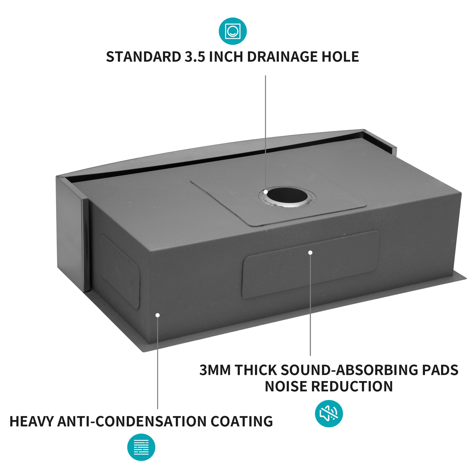 - [Coating and Silencer Pad] A thick coating on the outside of the sink prevents condensation caused by weather changes. Additionally, the thick rubberized silencer pad greatly reduces noise from the faucet, giving you a quieter cooking environment.