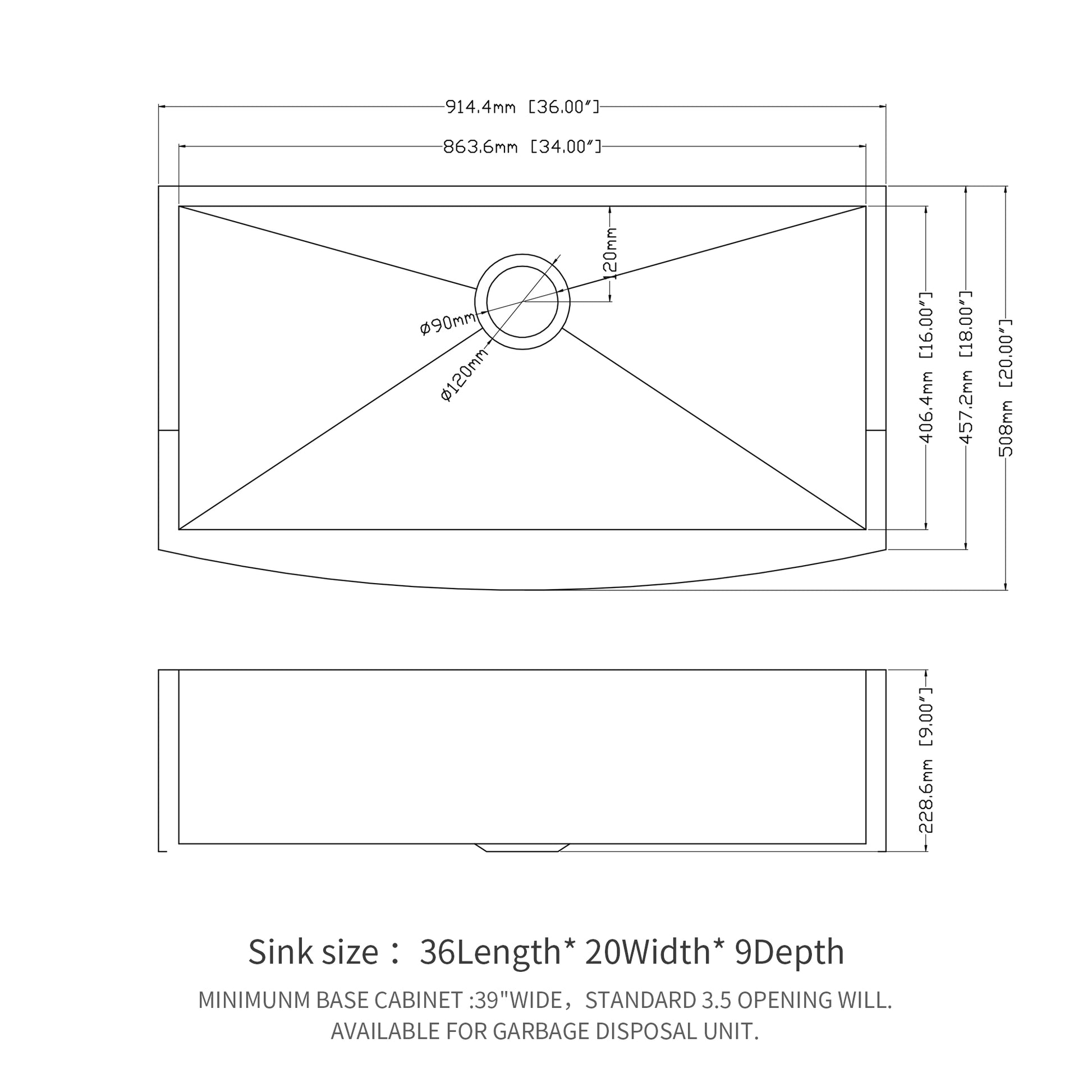 - [Dimensions] External Dimensions:36 x 20 x 9 inches, Internal dimensions: 34 x 16 inches. Minimum cabinet size is 39 inch. Standard 3.5" drain openings will fit any garbage disposal unit. Recommended Cutout Size: 34 x 18 inches.