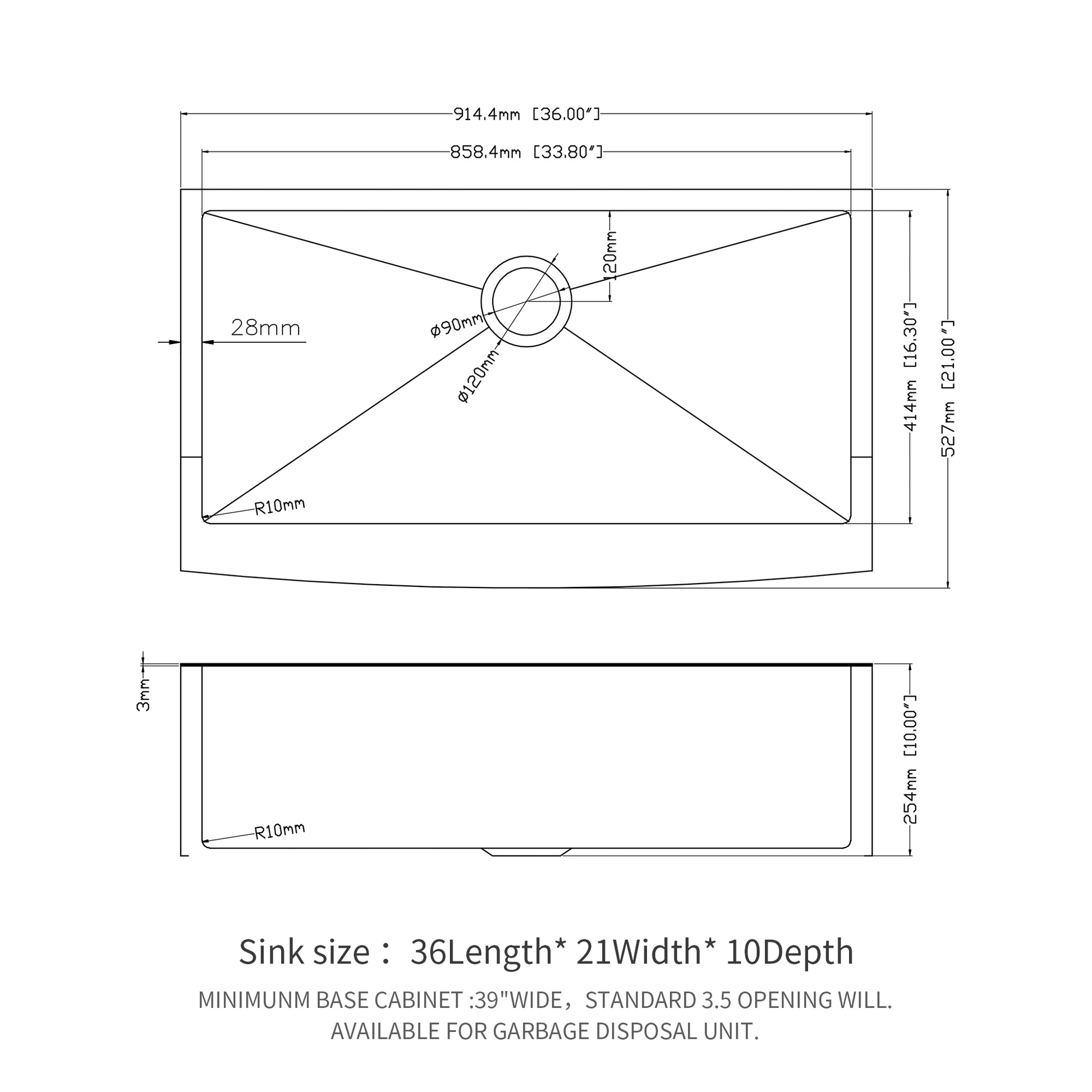 - [Dimensions] External Dimensions:36 x 21 x 10 inch, Internal dimensions: 33.8 x 16.3 inch. Minimum cabinet size is 39 inch. Farmhouse Sink rear set 3.5” drain hole that matches most kitchen appliances and fits the most common garbage disposal system.