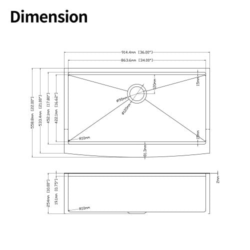 - Farmhouse Apron Single Bowl Stainless Steel Kitchen Sink with an integrated ledge to support sliding accessories. This sink creates a multifunctional workspace to streamline all your kitchen tasks. The workstation kit allows you to work over the sink without losing counter space. The sink uses dent-resistant T304 stainless steel for superior strength and durability.Dimension: Overall size: 36"x22"x10", Interior bowl: 34"x16.62", Detph: 9"
