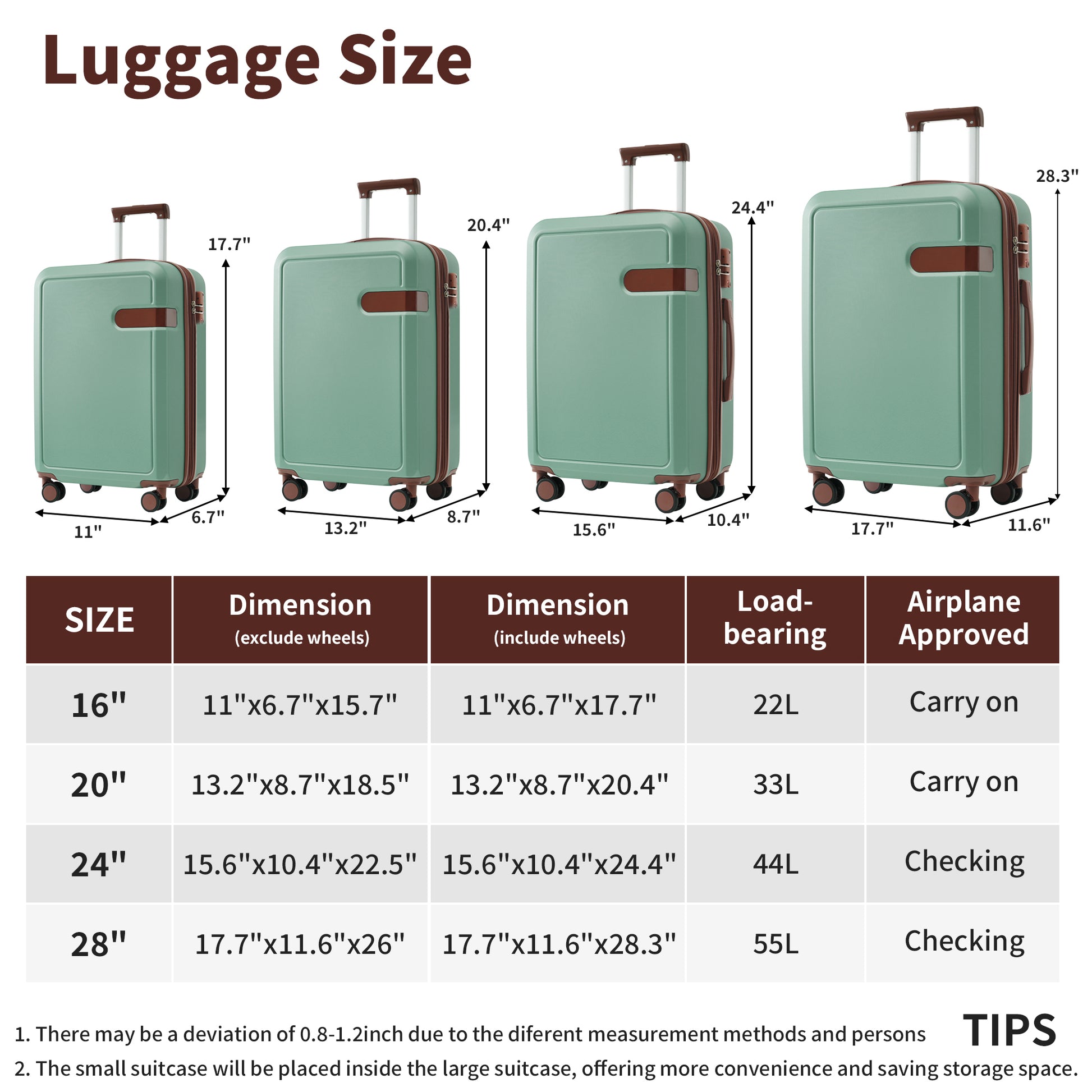 - [Luggage Size-included accessories]: 16 IN luggage dimensions:11"x6.7"x17.7"; 20 IN luggage dimensions: 13.2"x8.7"x20.4";24 IN luggage dimensions:15.6"x10.4"x24.4";28 IN luggage dimensions:17.7"x11.6"x28.3".