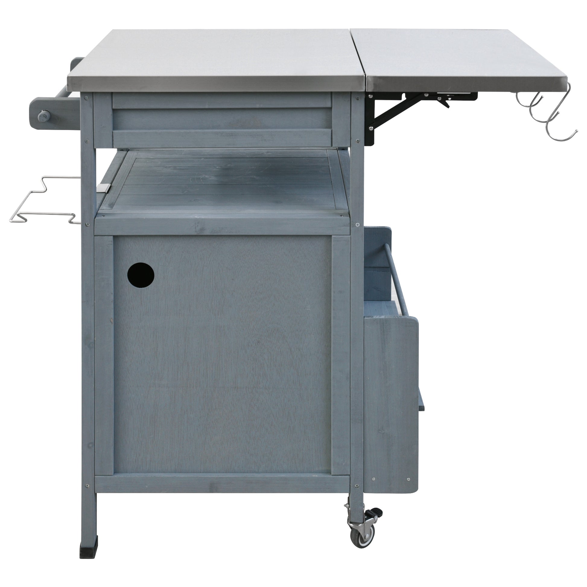 40.5" Outdoor Grill Cart with Stainless Steel Top, Solid Wood Outdoor Storage Cabinet with Drop Leaf, One Drawer, Towel Rack, Rolling Kitchen Cart with Lockable Wheels for Lawn Garden, Blue Grey