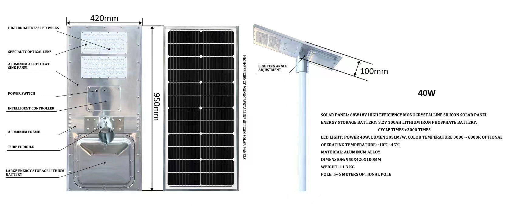 - Powered by crystalline silicon solar cells, maintenance-free valve-regulated sealed batteries (lithium batteries) store electric energy, ultra-bright LED lamps are used as light sources, and controlled by intelligent charge and discharge controllers, which are used to replace the street lights of traditional public electric lighting.