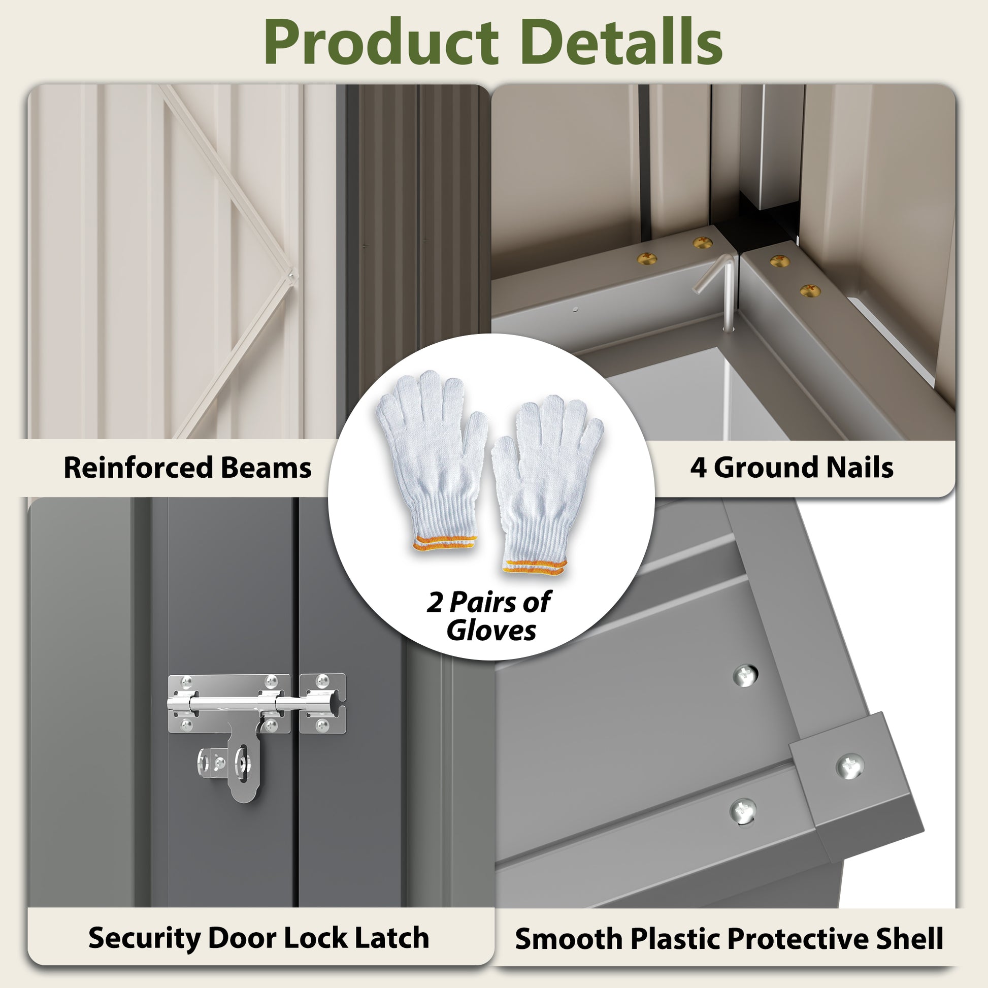 - 1. Classic Olive grey Galvanized Steel ConstructionFeaturing a durable galvanized steel build with an elegant brown finish, this shed provides superior resistance against corrosion, rust, and strong winds. Engineered to endure harsh weather conditions, its robust structure can withstand wind speeds of up to 70 mph, ensuring long-lasting protection for your outdoor belongings.