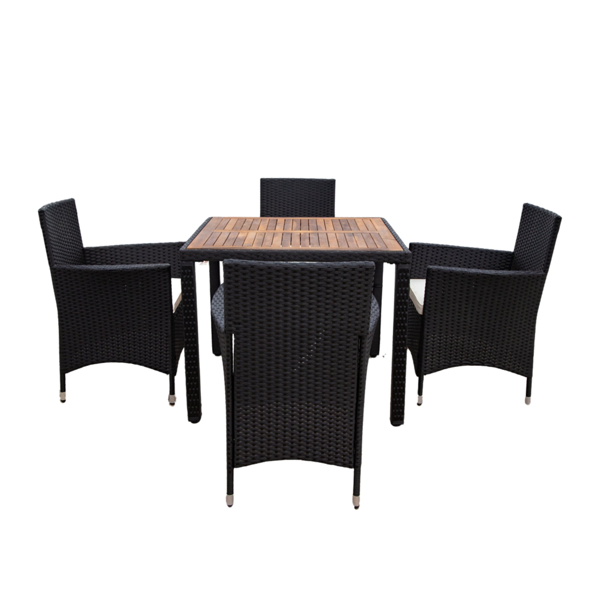 5 piece Outdoor Patio Wicker Dining Set Patio Wicker Furniture Dining Set w/Acacia Wood Top Black Wicker + Creme Cushion