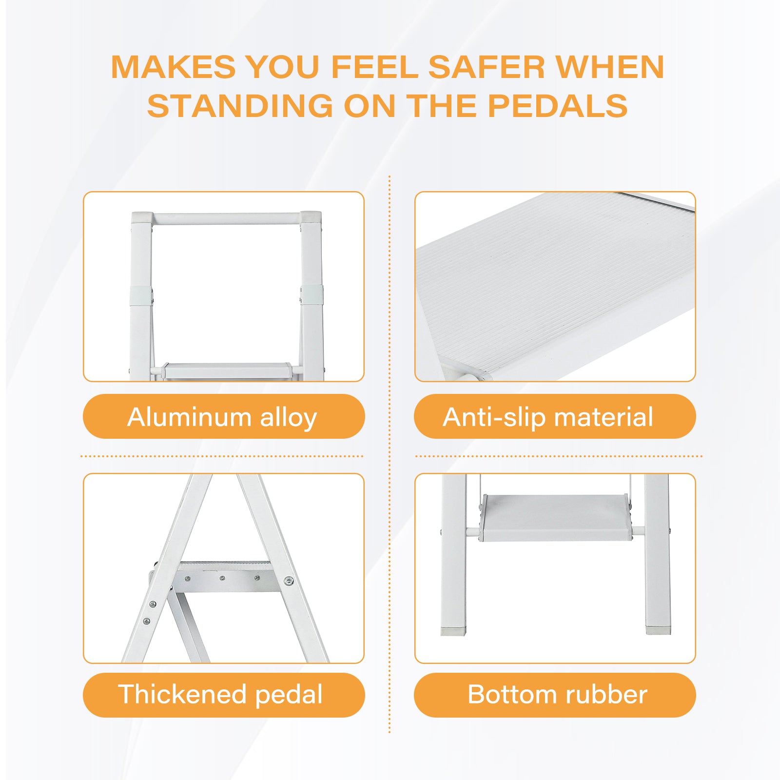 - 【Step Stool & Shelf】 - With modern design, our aluminum foldable stepladder stool can fit in your house like a furniture. The step ladder is easy to fold up and unfold, can put it in your closet when not use, it good for kitchen, bedroom, library, classroom to use. Can be used as a flower stand, when idle.