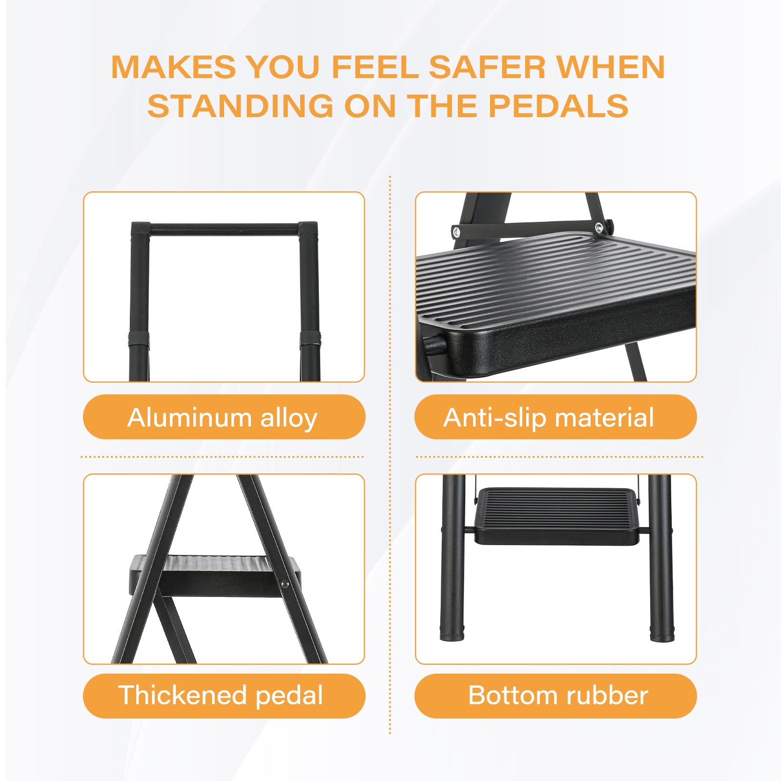 - ANTI-SLIP AND WIDEN DESIGN : Each step features anti-slip and widen pedals to ensure maximum safety during climbing work. The base of the ladder is equipped with friendly PVC material protective padding to protect floor from scratches and withstand heavy pressure.