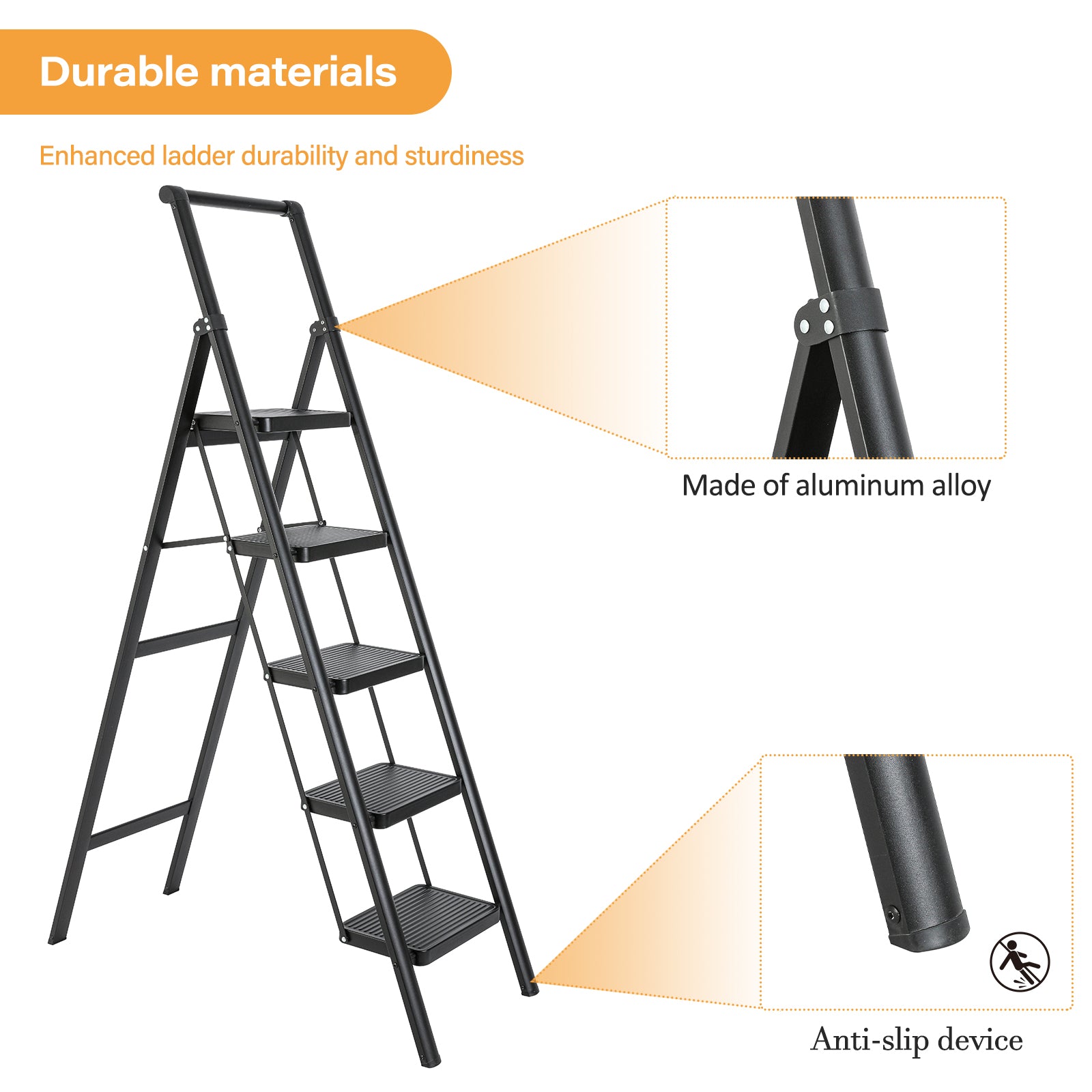 - SECURITY AND STABILITY : The 5 step ladder was constructed out of thick and high-strength aluminum tube. The black fixing part between the handrail and main frame is made of high-quality aluminum alloy to ensure the ladder in use stronger and more durable.