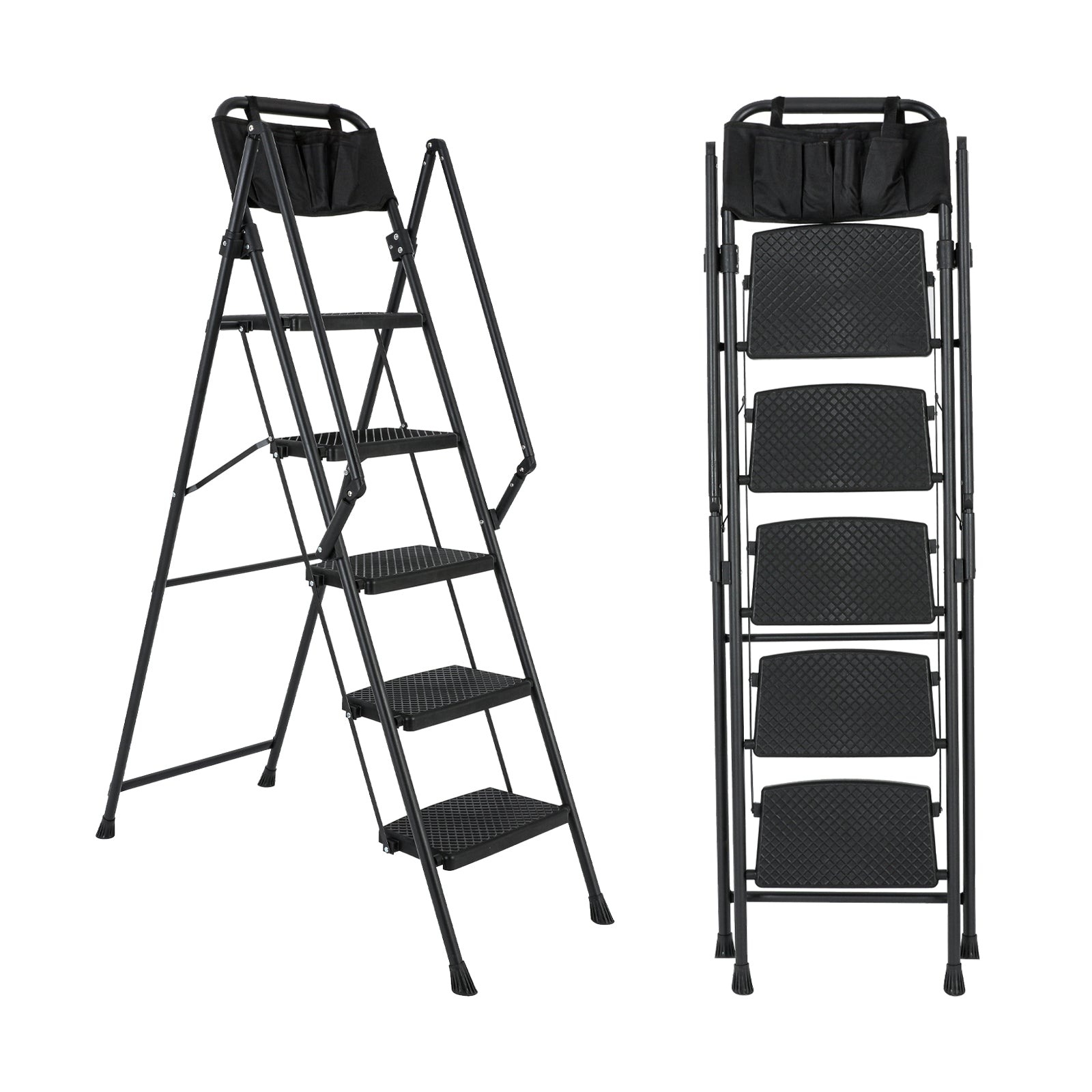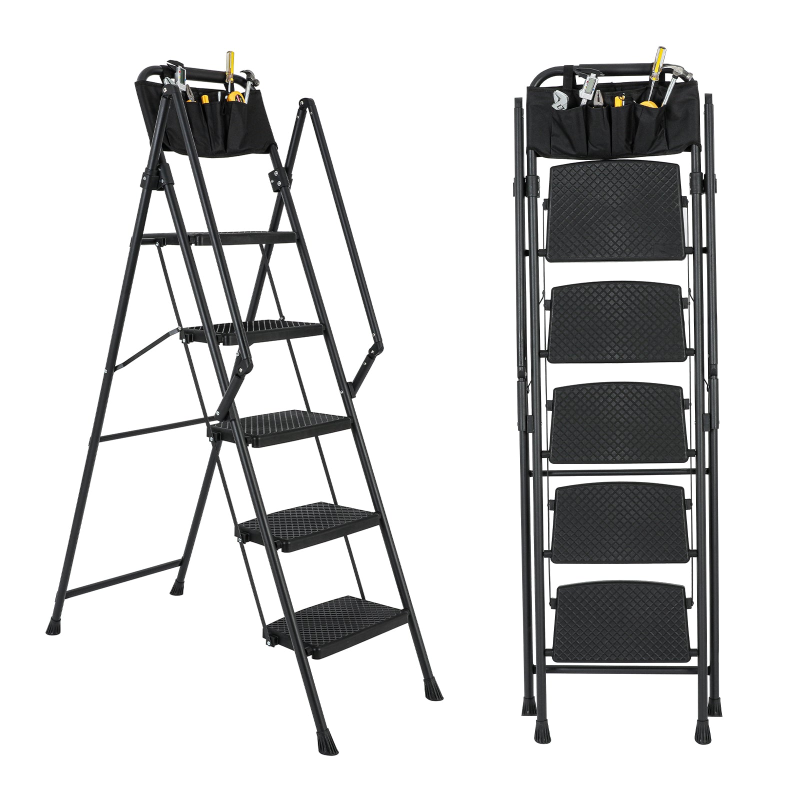 5-Step Foldable Light Weight Wide Anti Slip Pedal and Safety Handle, Sturdy Multi-Purpose Step Ladder with tool bag
